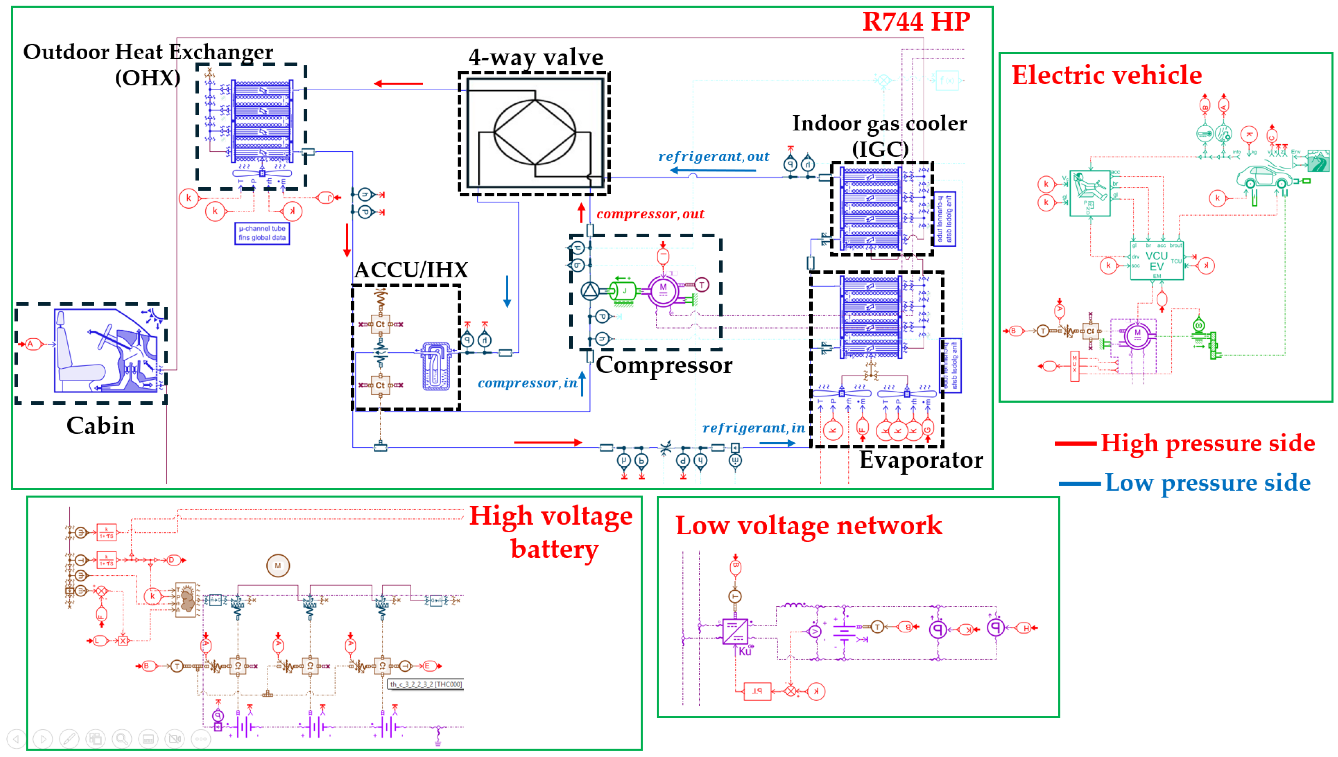 12]. Regarding the heat exchangers, the model calculates heat transfer phenomena in real-time by dynamically computing the convective heat transfer coefficient based on the immediate environmental conditions for both cooling and heating modes. Although the same heat-exchanger component model is used to represent both the evaporator and the in-cabin heat exchanger within the simulation framework, their thermodynamic roles differ depending on the operating mode. In heating operation, the heat exchanger functioning as the indoor heat exchanger (physically a gas cooler in the transcritical R744 cycle) is connected in parallel with the evaporator and activated by switching the refrigerant flow path through a 4-way valve. Under this mode, high-temperature and high-pressure refrigerant discharged from the compressor flows directly into the indoor heat exchanger. Consequently, the inlet enthalpy of the gas cooler includes the compressor work. The heating capacity is therefore calculated from the refrigerant-side enthalpy difference across the indoor gas cooler, whereas the cooling capacity is obtained from the enthalpy difference across the evaporator in cooling mode. Because the inlet enthalpy of the gas cooler already accounts for the compressor work, the magnitudes of heating and cooling capacities are neither physically nor numerically identical. The refrigerant-side energy balance is consistently satisfied in the model, such that the heating capacity equals the sum of the cooling capacity and the compressor work. Finally, the complete automotive R744 heat pump system was modeled within the AMEsim environment, as depicted in