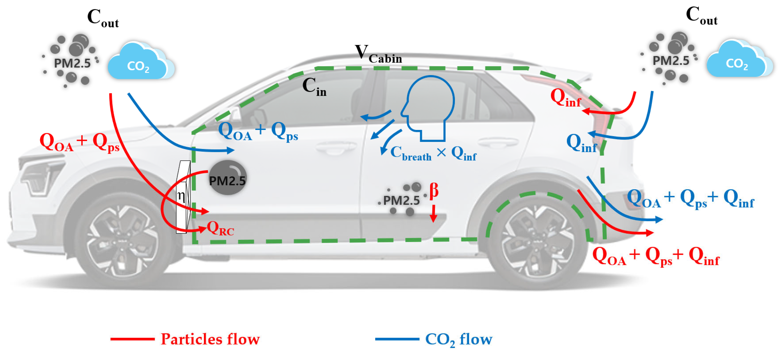 2), generated by occupant breath, and fine particulate matter (PM2.5) with an aerodynamic diameter of 2.5 μm or less, which infiltrates from the external environment. The in-cabin concentration of each pollutant was modeled based on a mass balance equation, which accounts for the rates of inflow, generation, exit, and removal within the vehicle interior [