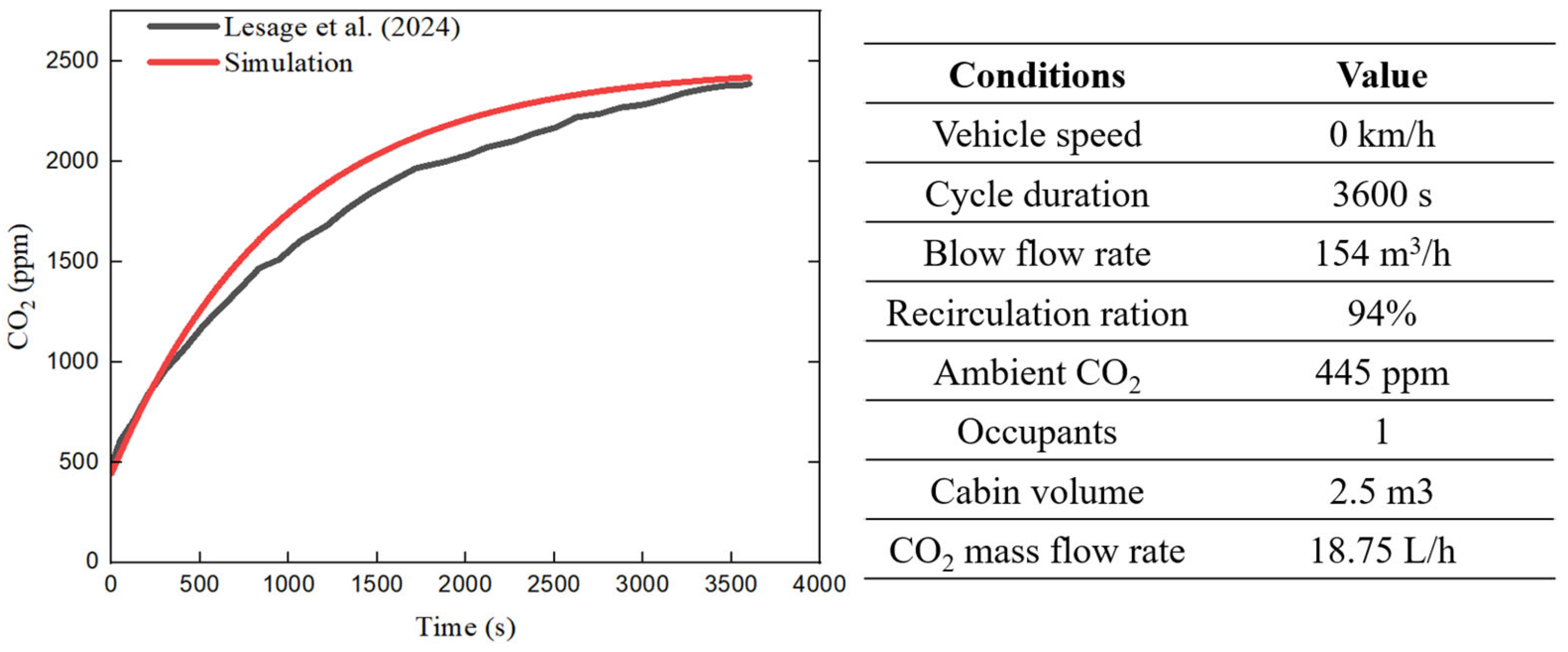 ). In addition, the simulation model assumes a perfectly mixed cabin air volume, whereas the experimental measurements were obtained at localized positions within the cabin. This difference in spatial representation between the lumped-parameter model and point-wise experimental measurements further contributes to the observed deviations. These discrepancies therefore reflect systematic modeling uncertainties associated with parameter identification and spatial averaging, rather than stochastic errors originating from measurement equipment.