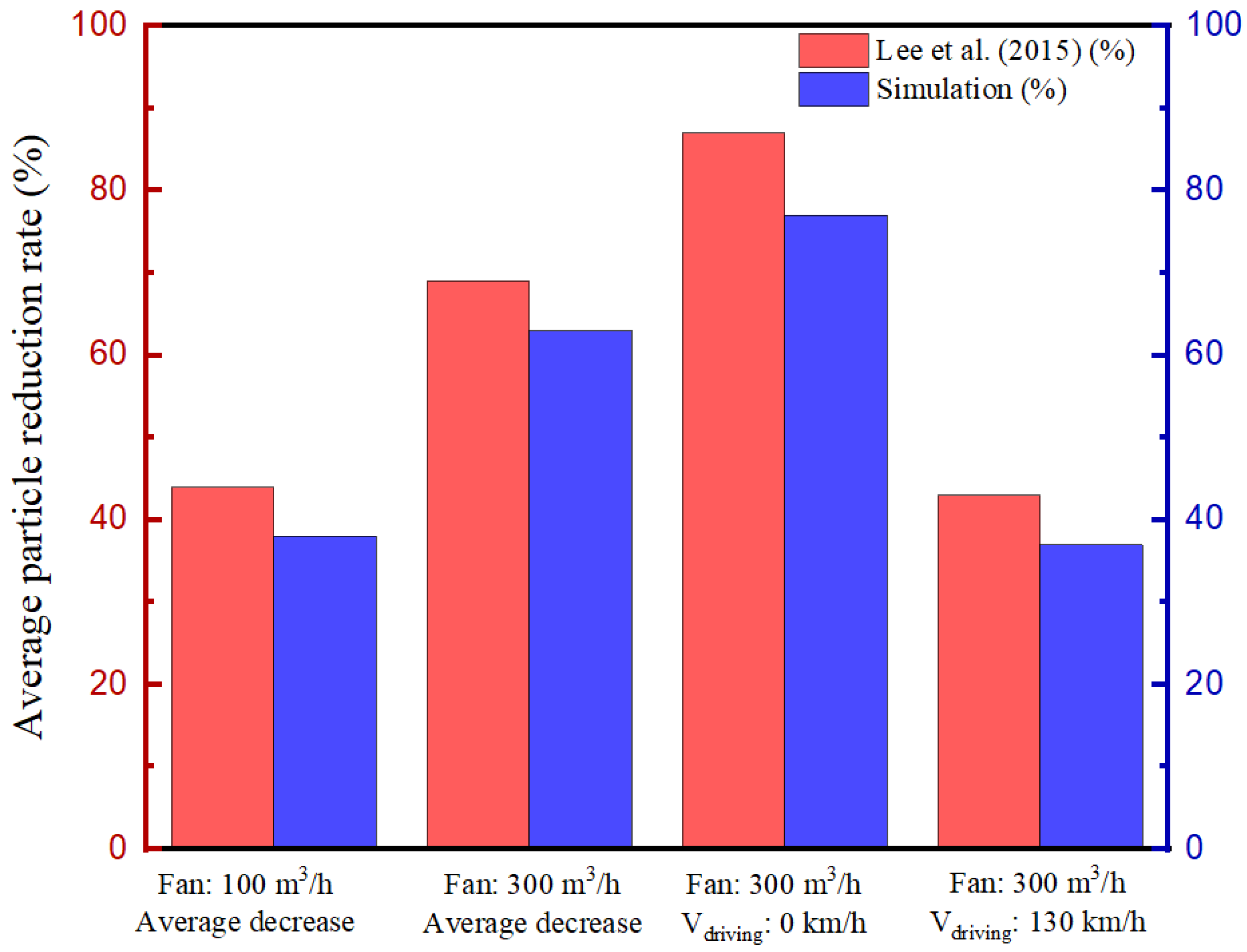 4]. It should be noted that these two metrics (UFP and PM2.5) reflect distinct physical characteristics, thus limiting the possibility of a direct absolute quantitative comparison. Accordingly, this validation is primarily used to verify that the model can accurately capture the overall qualitative trends associated with different ventilation strategies. To support this qualitative assessment, the relative error between the simulation and reference data for all evaluated parameters remained within 10%. Furthermore, the system exhibited behavior that closely followed the qualitative trends associated with variations in blower speed and driving speed.