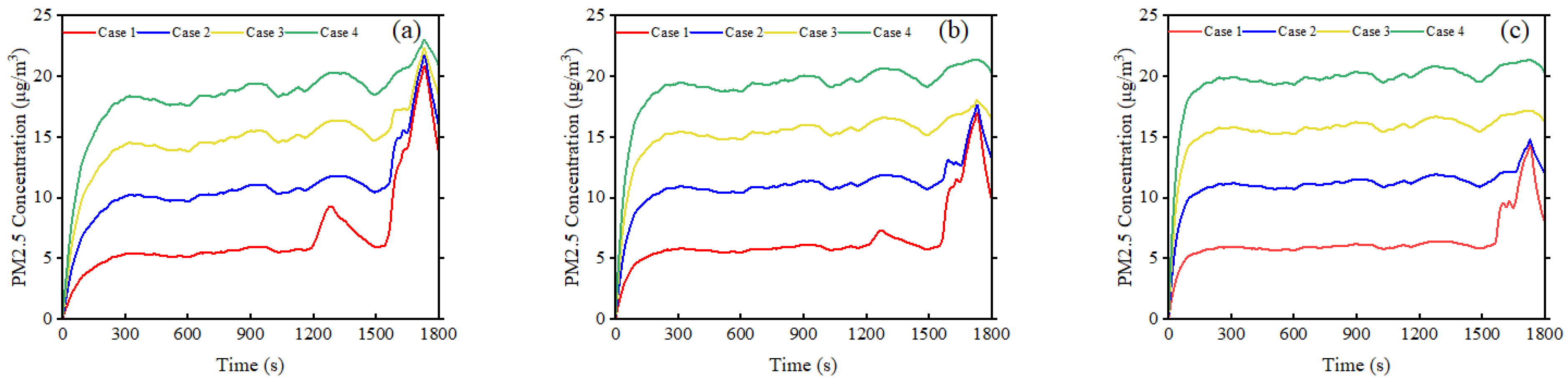 Figure 9, the primary source of PM2.5 is the external environment; therefore, the fresh air intake rate directly affects the in-cabin concentration. Consequently, the case with the lowest fresh air intake (10%) maintains the lowest PM2.5 concentration. This result is attributed to the minimization of external pollutant inflow, coupled with the continuous recirculation and purification of the cabin air through the HVAC filter. Conversely, the case with the highest fresh air intake (40%) exhibits the highest PM2.5 concentration. This indicates that despite the presence of the HVAC filter, which removes a portion of the incoming pollutants, the increased total mass of contaminants infiltrating from the outside air led to an increase in the in-cabin concentration. Furthermore, as observed in