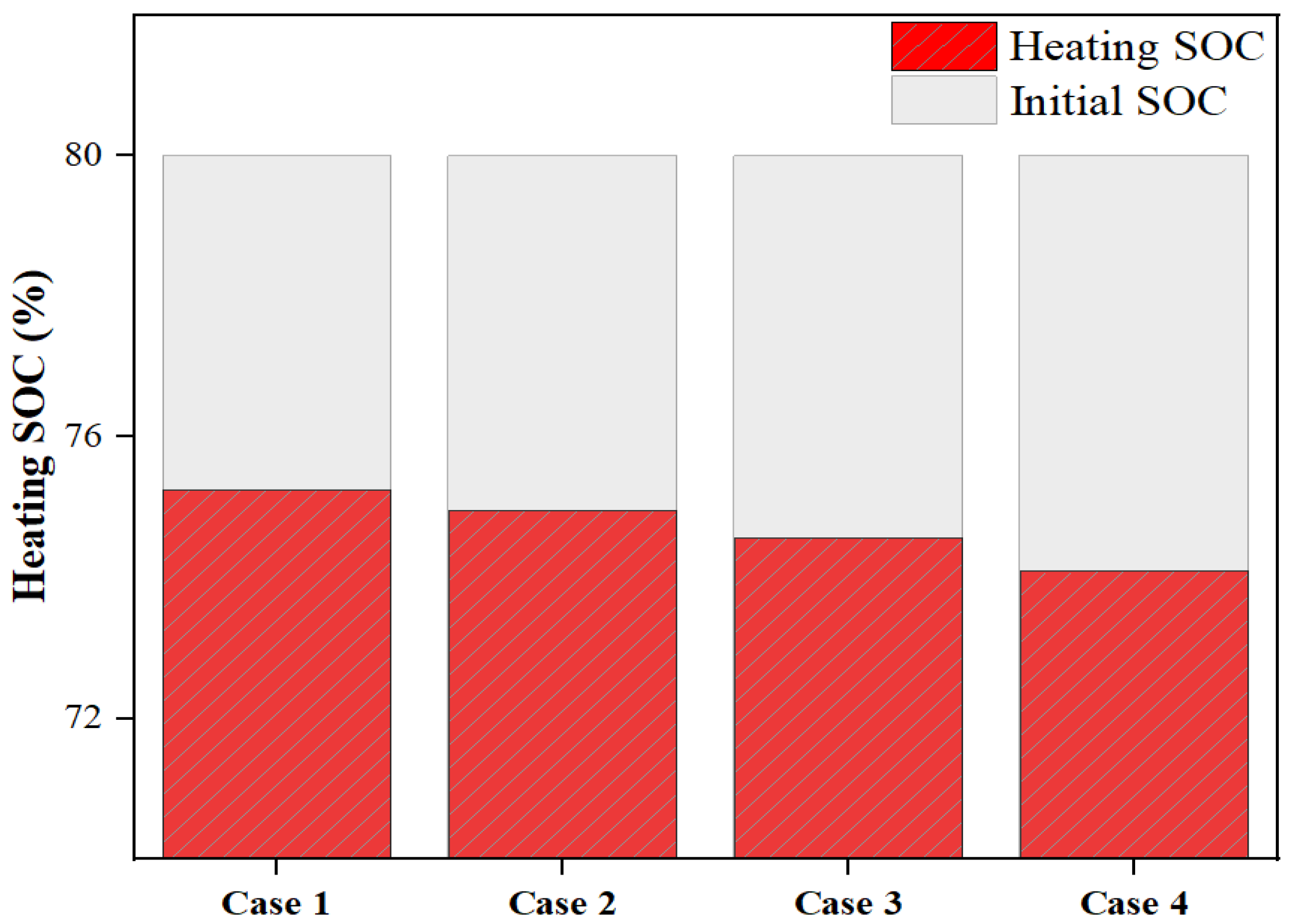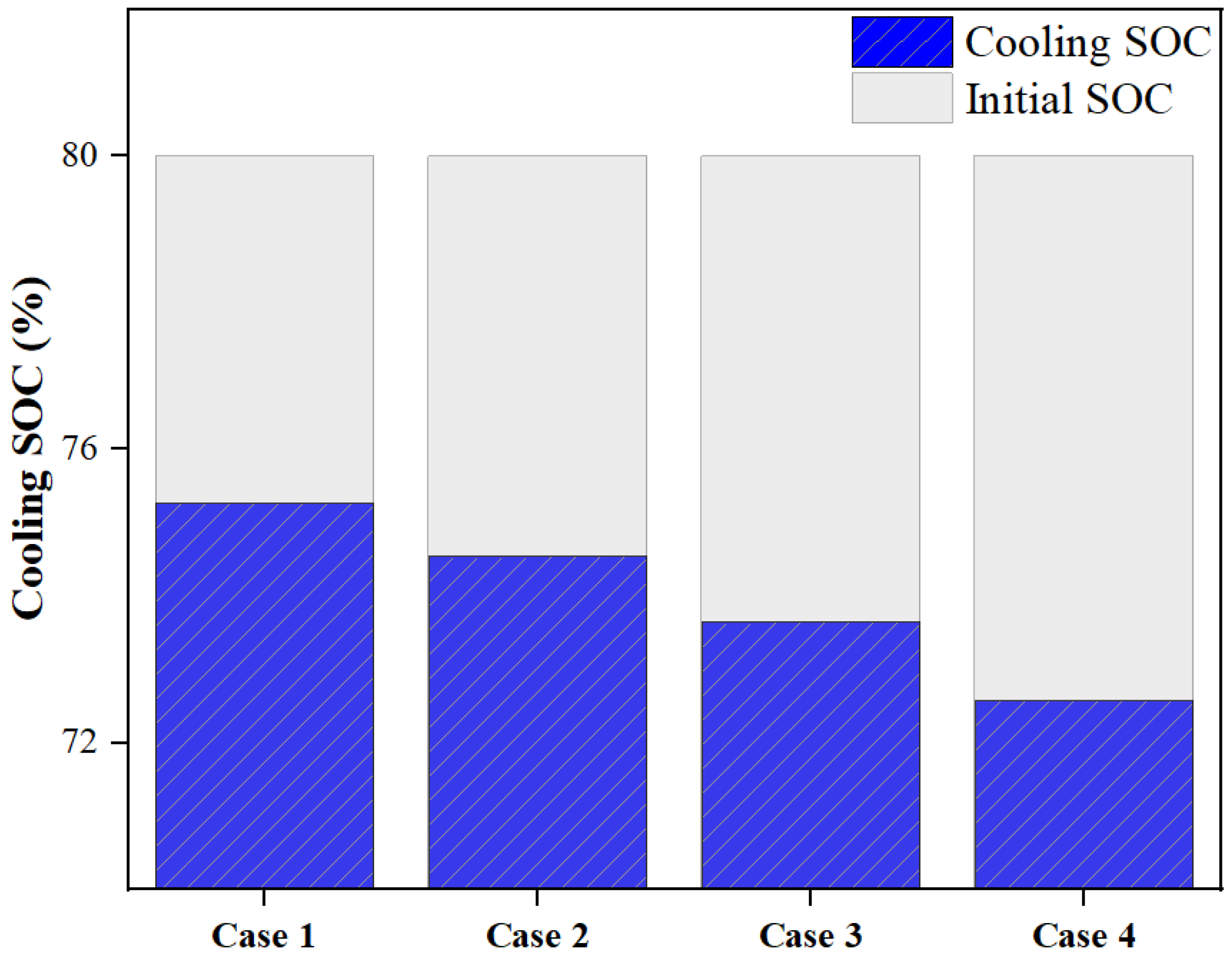 Figure 13, the results demonstrate that as the fresh air intake ratio rises, the total SOC consumption progressively increases from 4.74% to 7.42%, representing a maximum increase in energy depletion of 57% compared to Case 1. This finding is a direct consequence of the aforementioned increase in compressor power consumption, which, driven by the higher thermal load resulting from increased fresh air intake, consequently leads to greater overall battery consumption.