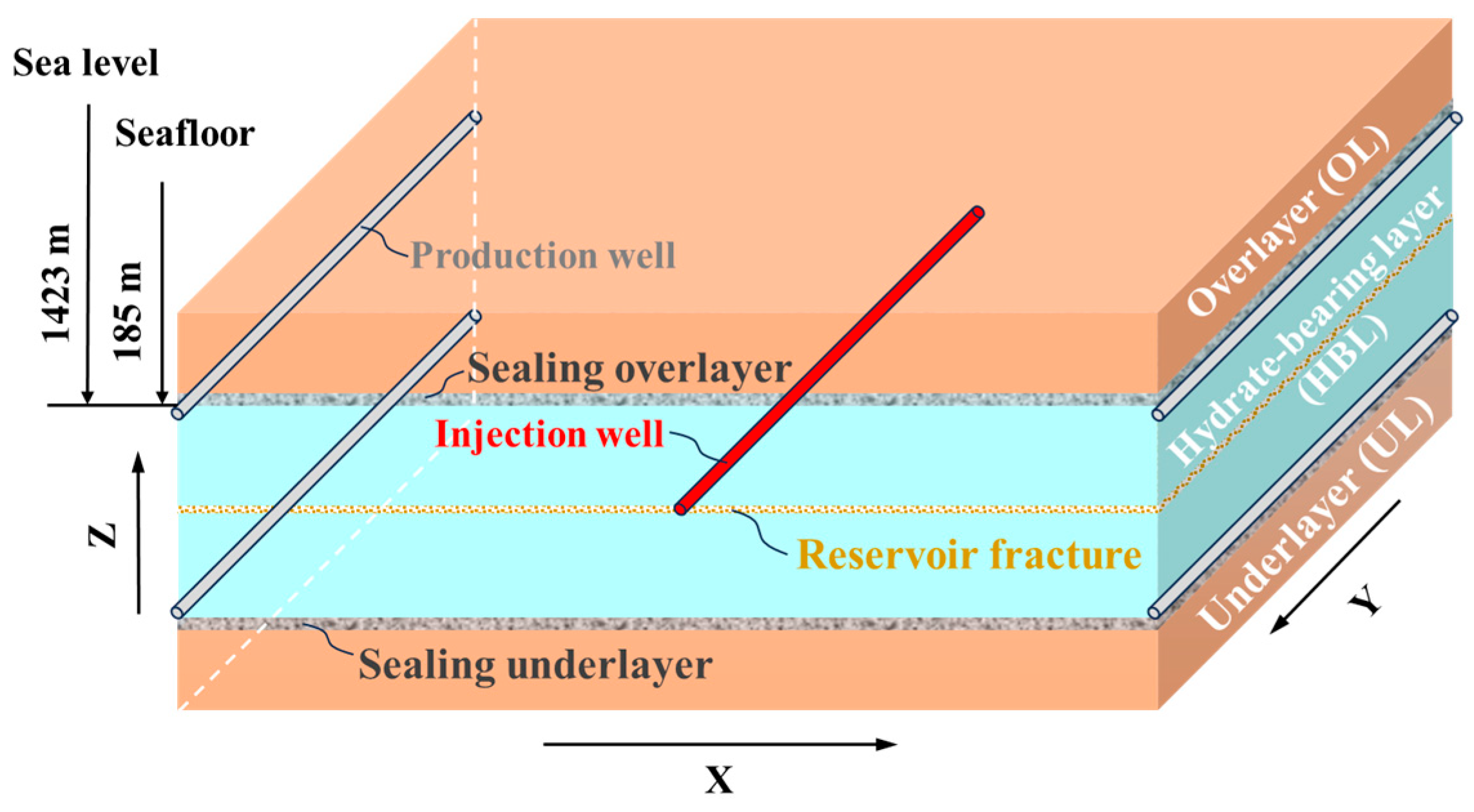 - Zhong, X.; Pan, D.; Zhu, Y.; Wang, Y.; Tu, G.; Nie, S.; Ma, Y.; Liu, K.; Chen, C. Commercial production potential evaluation of injection-production mode for CH-Bk hydrate reservoir and investigation of its stimulated potential by fracture network. Energy 2022, 239, 122113. [Google Scholar] [CrossRef]