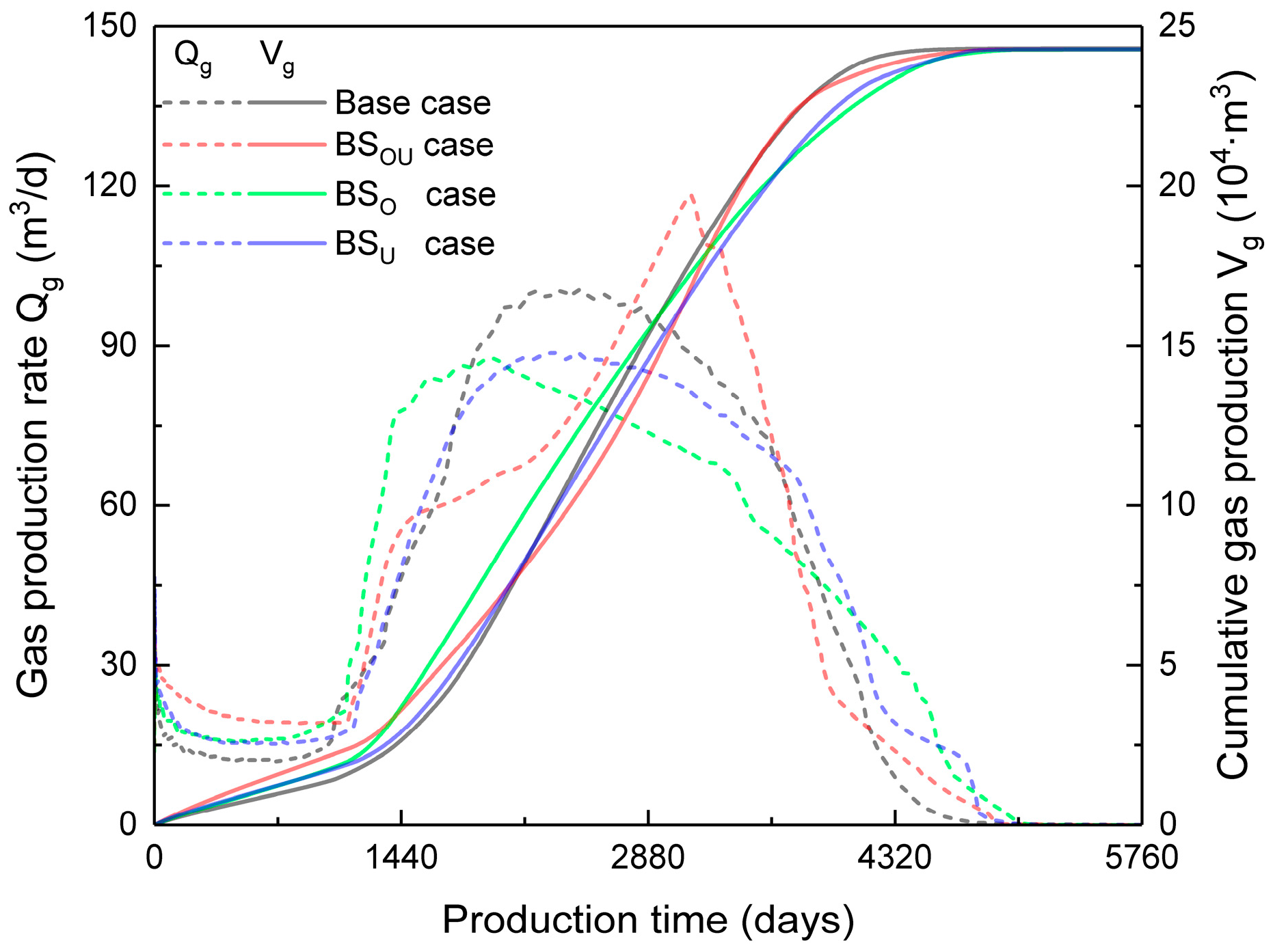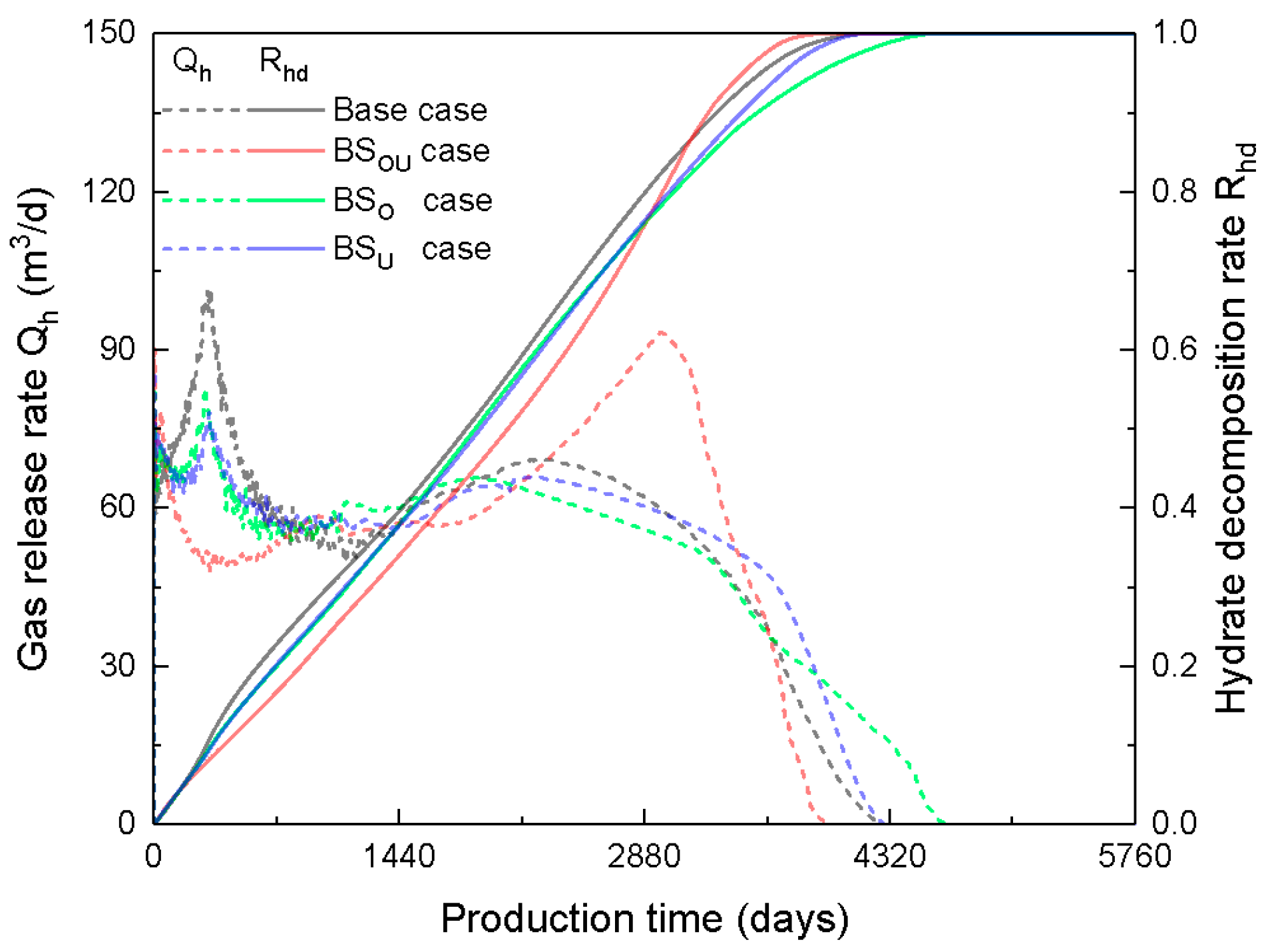 - BS can effectively address boundary water intrusion, hot loss, and methane leakage, thereby reducing water production and enabling the full utilization of injection energy. However, it cannot speed up hydrate decomposition and gas production. Additionally, partial sealing does not fully prevent hot water loss and gas escape.