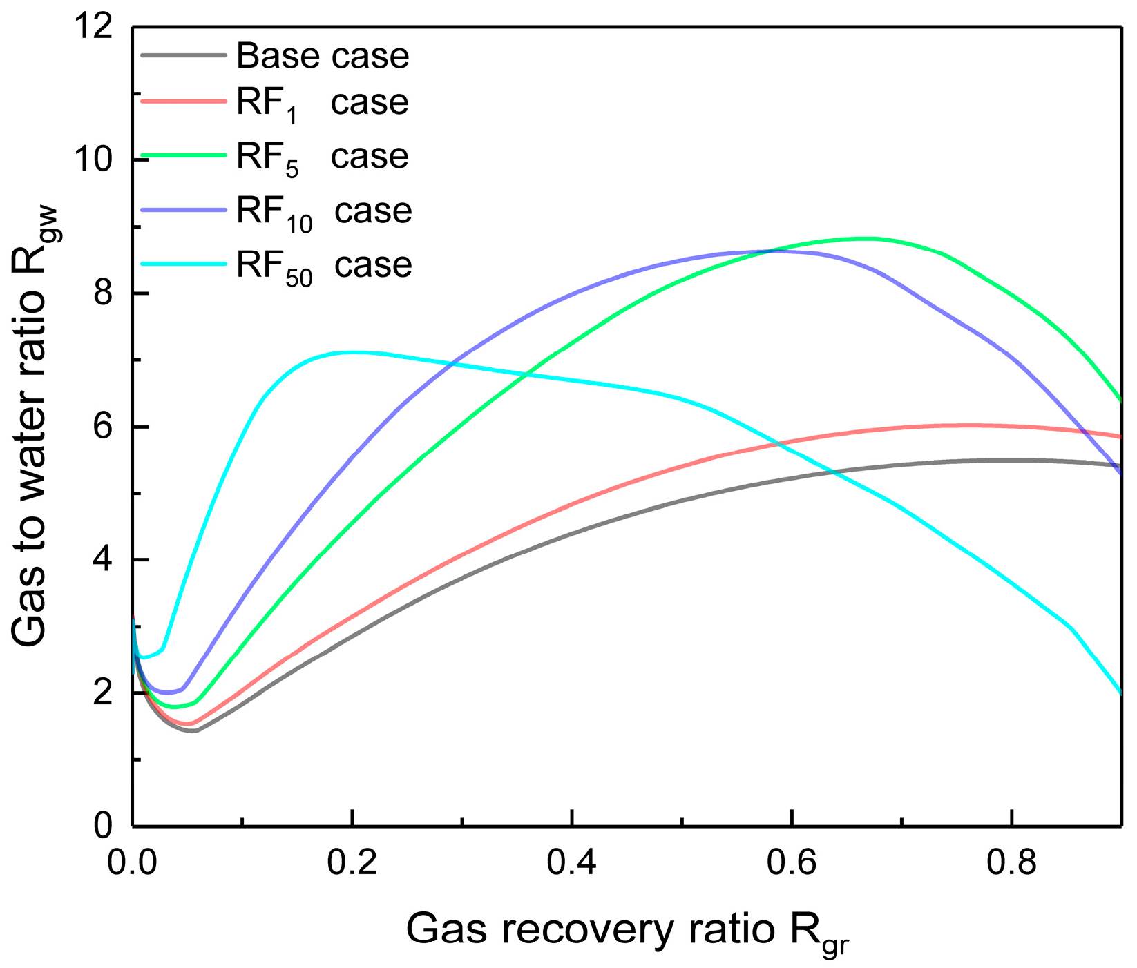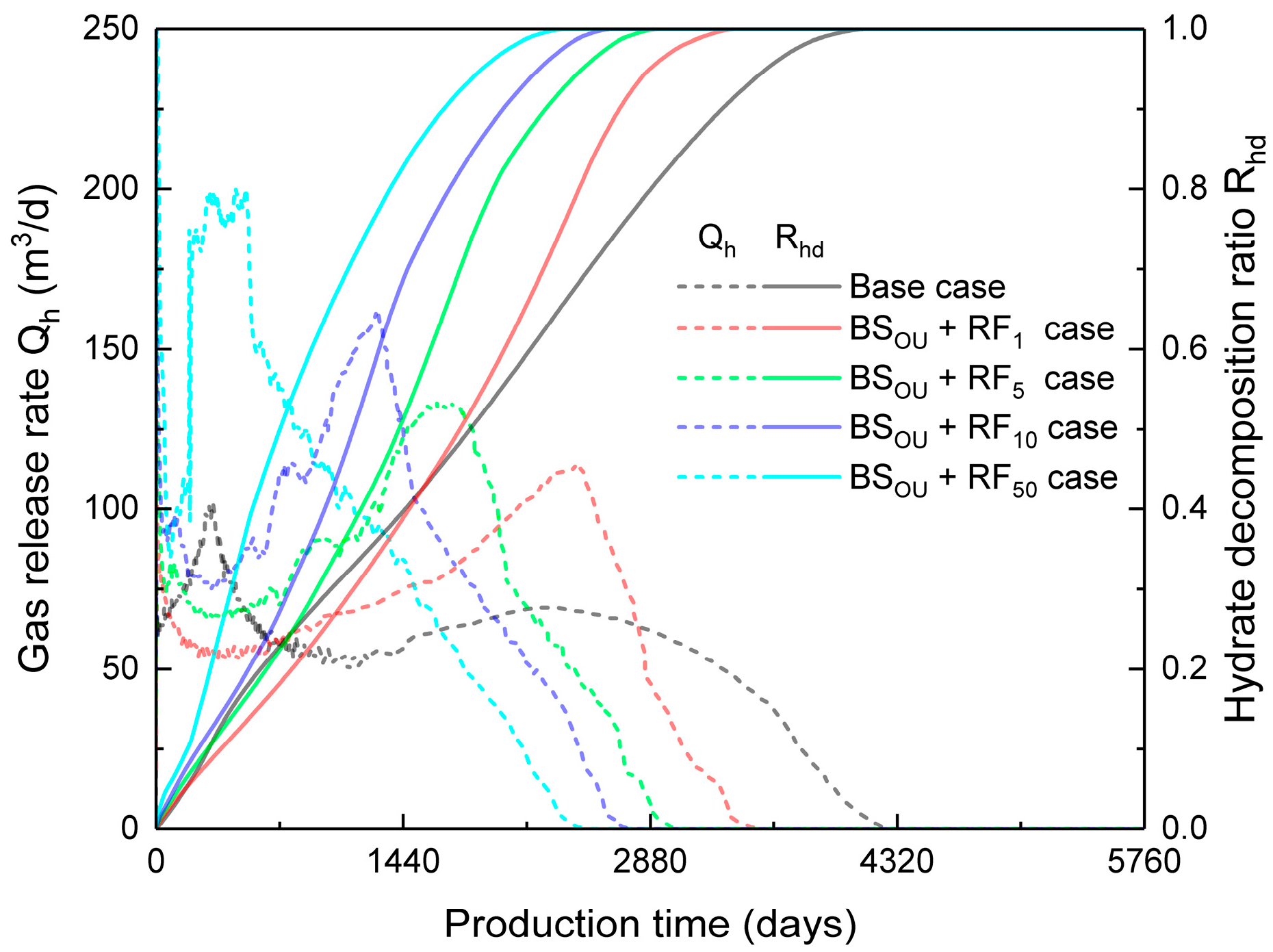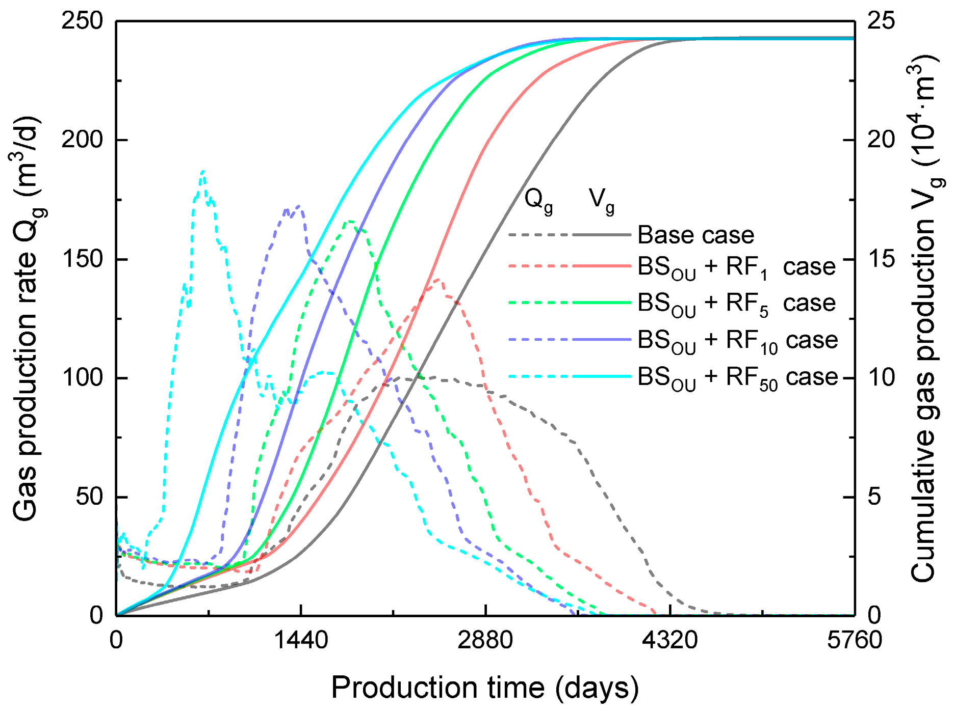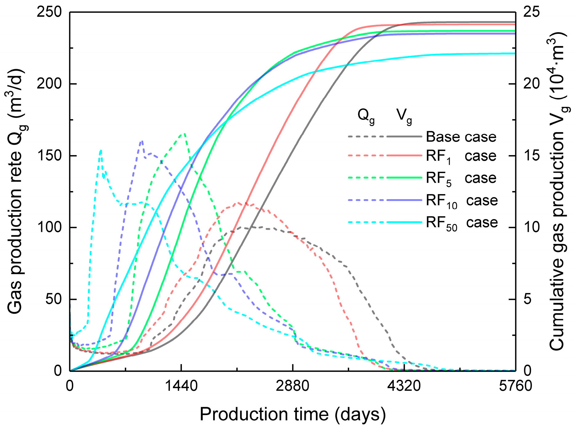 - There is no methane leakage under the synergistic effect of RF and BS. Furthermore, Qh and Qg improve significantly as Cf increases, whereas Rgw and ER show the opposite trend. Therefore, rational regulation of Cf value is essential to obtain satisfactory multi-well injection-production behavior, with 1–10 D·cm recommended.