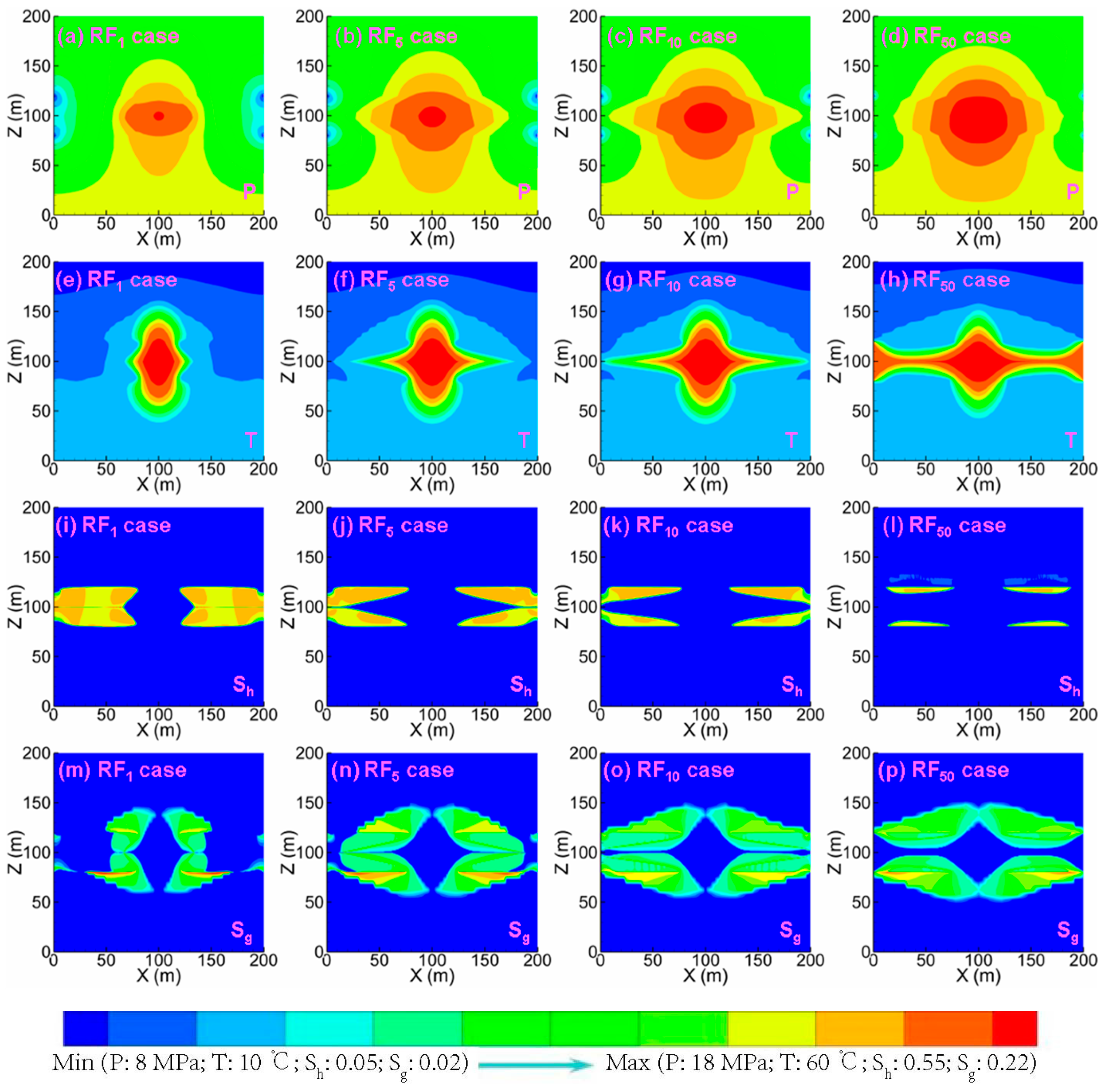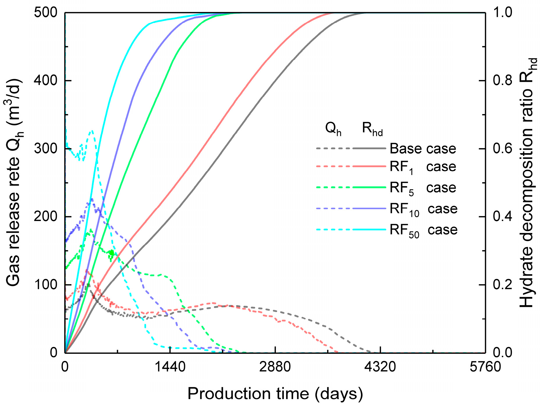 - RF is very effective in facilitating hydrate decomposition and gas recovery, and the extraction efficiency improves greatly with increasing Cf. However, the final ER is lower than 1.0 due to the severe water flooding induced by the fracture, making it unfeasible for economic extraction. Additionally, RF exacerbates the risk of gas leakage, which poses a great challenge for the safe exploitation of marine hydrates.