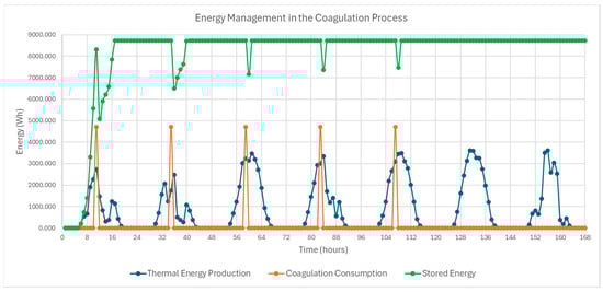 Within the program, the component related to the curing process and overall electrical consumption was designed to maximize the use of photovoltaic and wind generation to cover most of the facility’s demand, with priority given to critical loads such as the condensing unit and evaporator. The management strategy also considers the electrical needs of auxiliary equipment and the storage of surplus energy in the battery to guarantee supply during periods of low renewable generation. As illustrated in Figure 3, this component requires input variables such as solar radiation, wind speed, electrical demand, and battery capacity. For simulation purposes, the battery was assumed to be fully discharged at the initial time step.