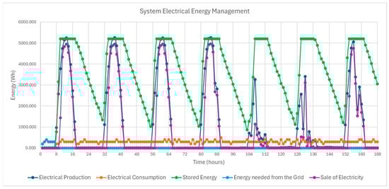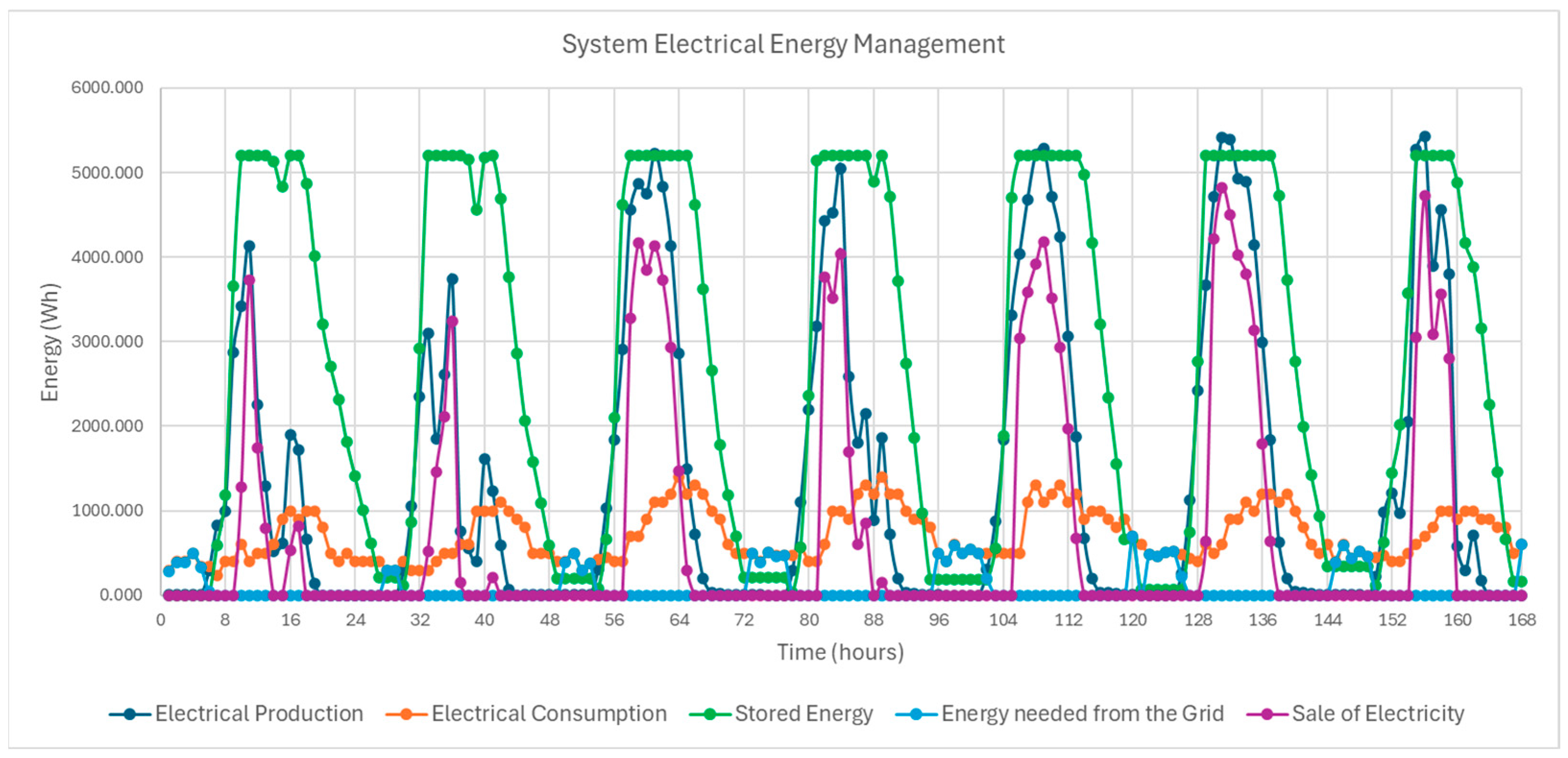 The simulation program was developed with an hourly time-step, corresponding to the smallest interval for which both energy production and consumption data were available. It was designed to evaluate weekly operation scenarios, by assessing the feasibility of the proposed prototype as a self-sufficient energy solution for cheesemaking units located in remote areas.