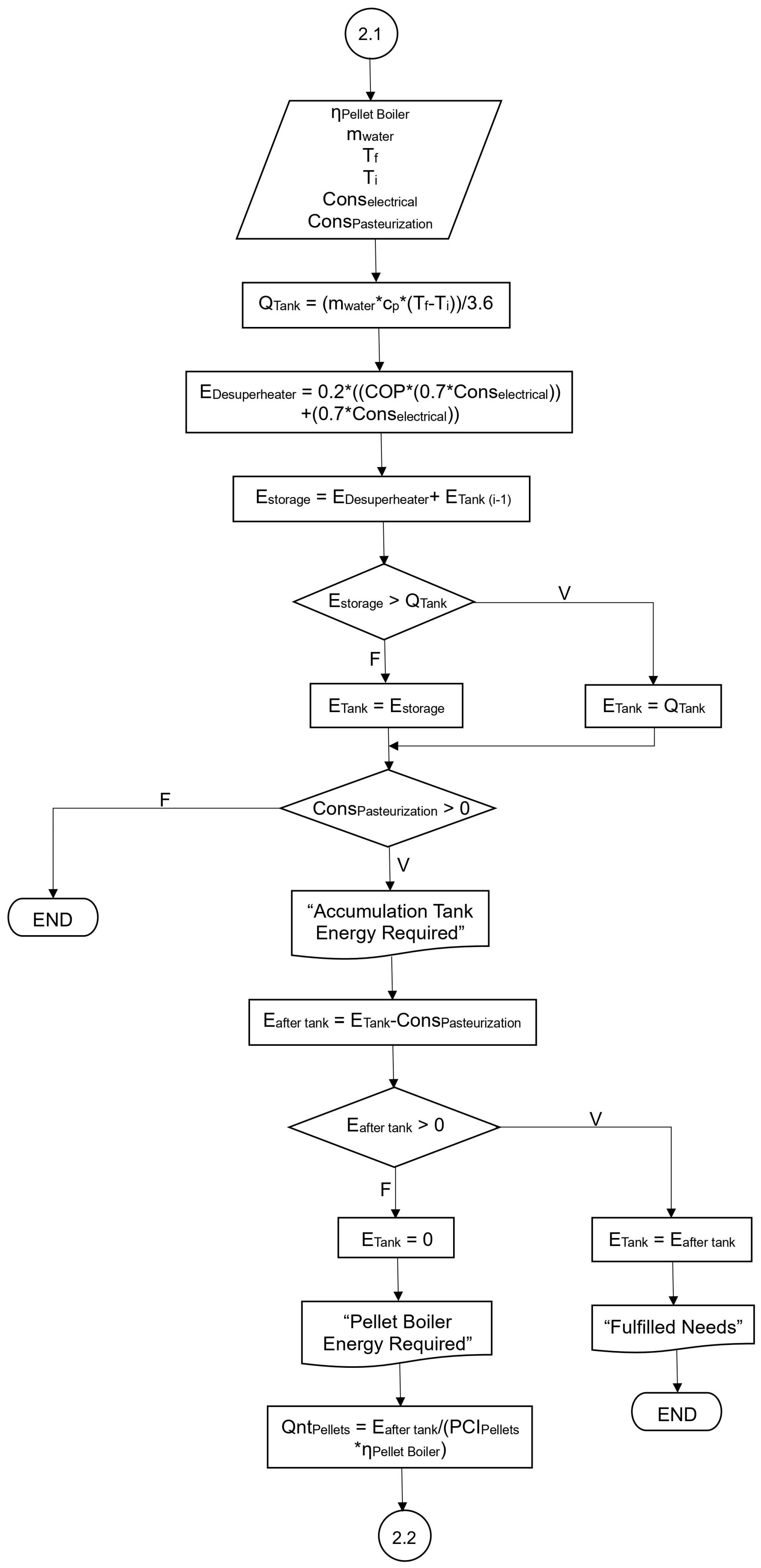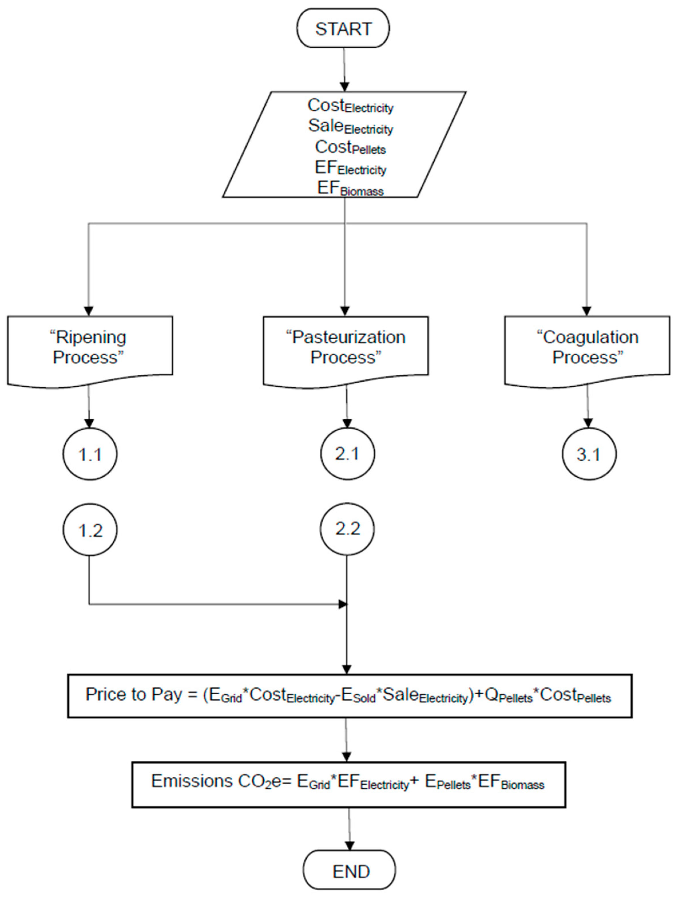After the input of the defined parameter, and as illustrated in Figure 2, the simulation tool manages the energy flows across the cheese production processes (1.1—curing/electrical subsystem, 2.1—pasteurization, 3.1—coagulation). This management determines the electricity purchased from the grid and the surplus sold to it (1.2), as well as the biomass pellet consumption (2.2). The specific algorithms for each process component are described in the following sections.