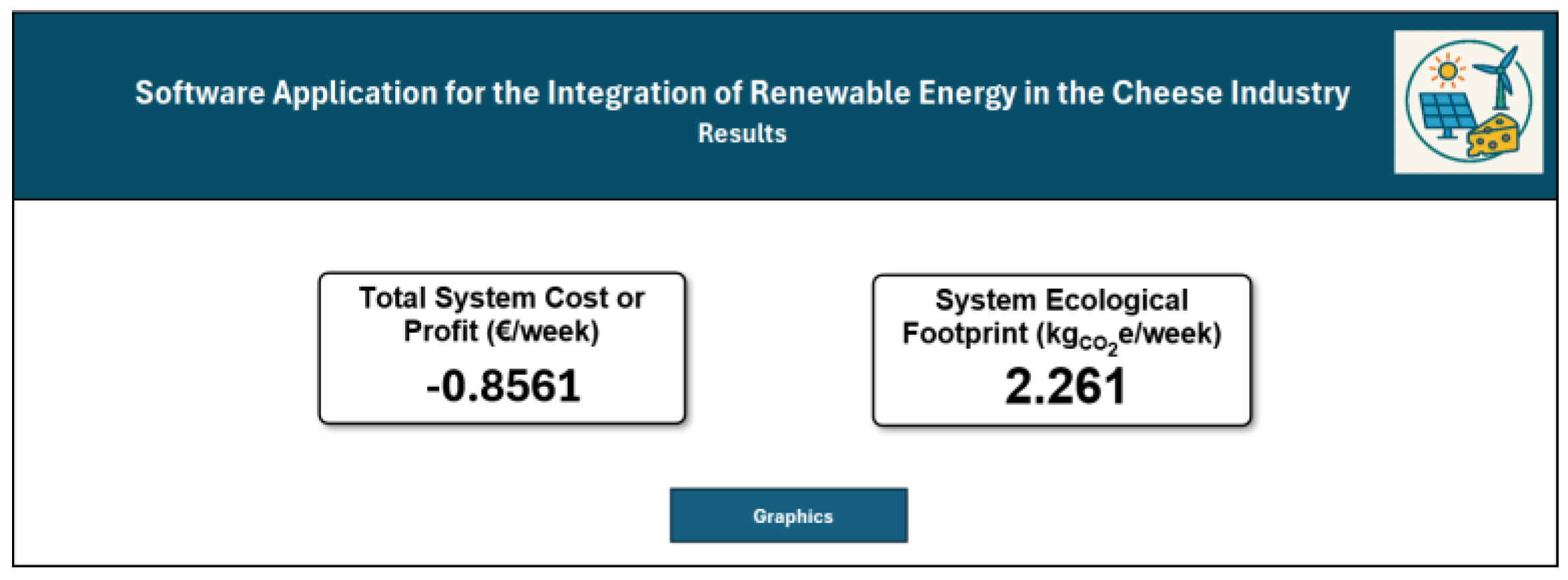 Accordingly, future work will focus on expanding the tool to include predictive energy control, scalability to other dairy processes, and long-term optimization of hybrid renewable configurations. Additionally, transitioning to a more suitable software platform could remove existing implementation limitations and enhance the tool’s applicability.