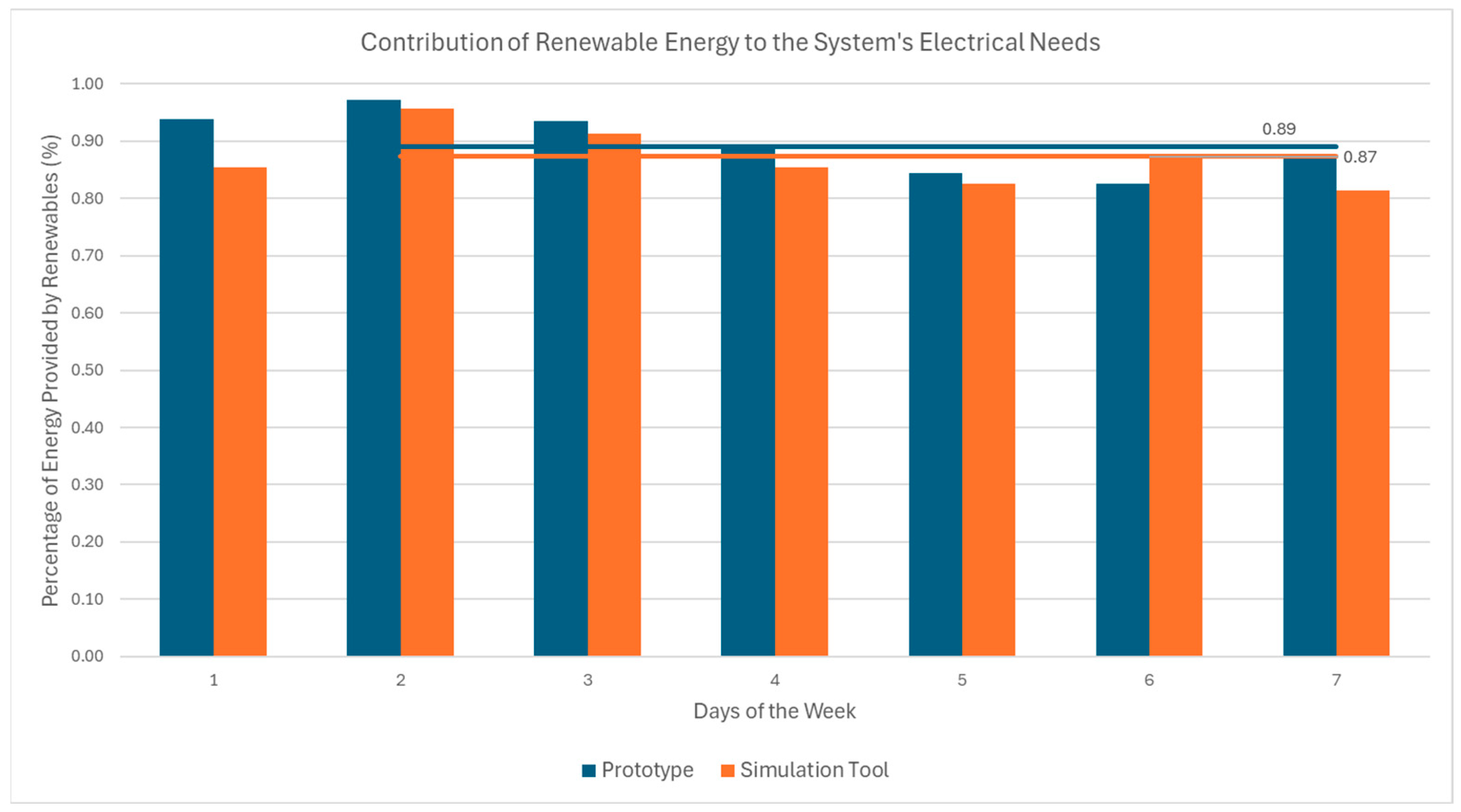 - The simulation tool accurately replicates the real operation of the prototype, with less than 2.3% deviation in renewable energy contribution.