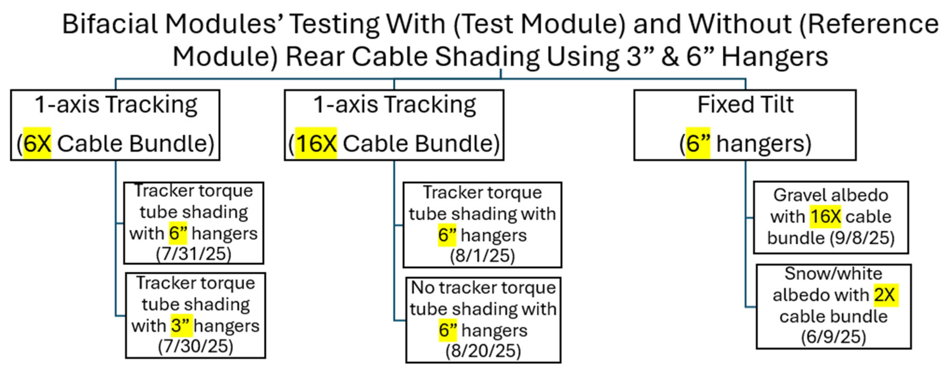 - Rear-side cable bundles (2X, 6X, 16X) suspended from 3” and 6” hangers have negligible impact, if any, on PV module performance (≤0.6% Pmax from cable bundle vs. 3–30% from mounting structures).
