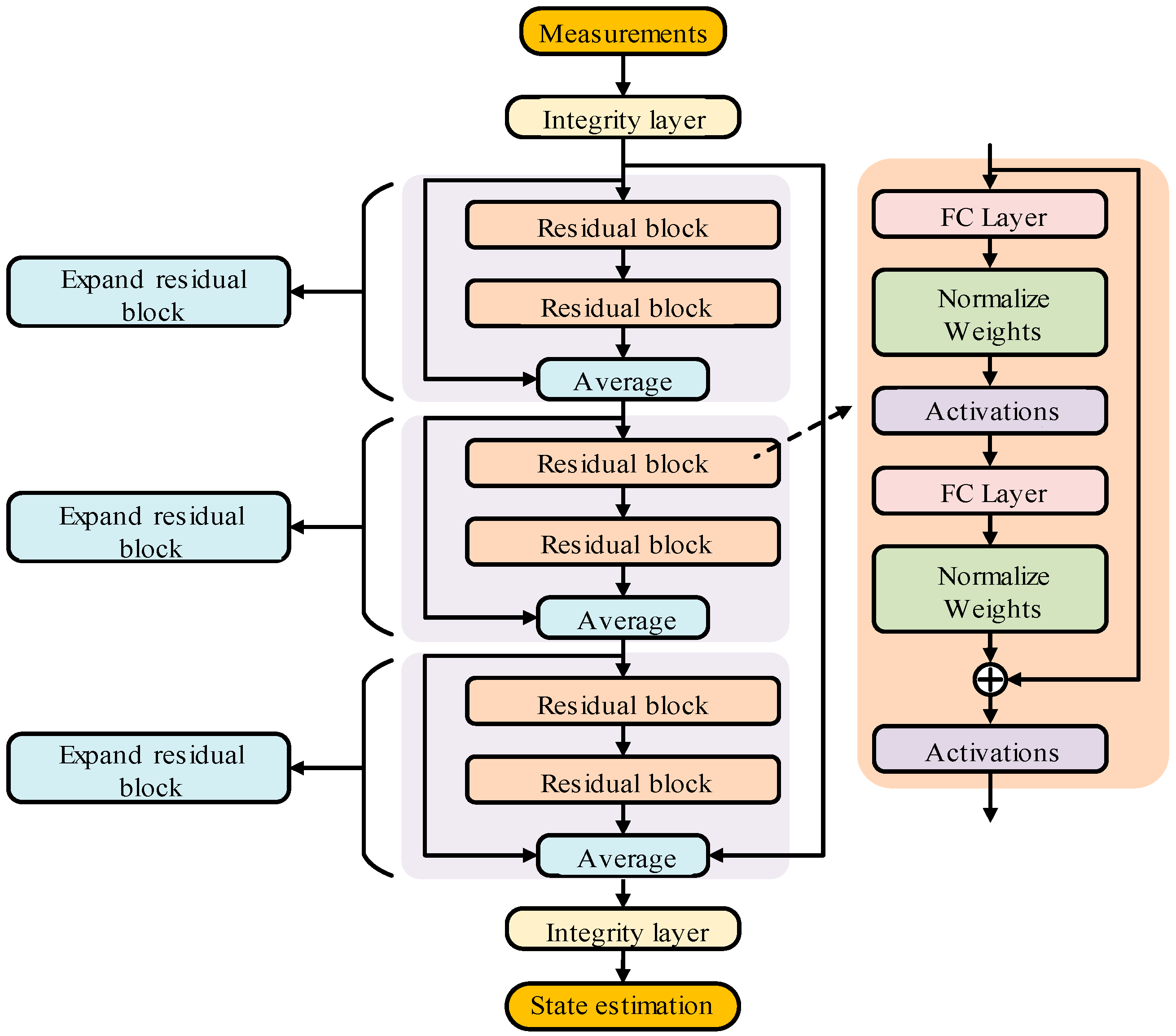 A state estimation model utilizing a deep residual neural network can be developed based on the previous discussion. Although deep residual neural networks are mainly used in image recognition and computer vision—areas with different task characteristics from the state estimation task described here—necessary adjustments are made to tailor the network to this study’s environment. This customized network is called i-ResNet, and its architecture is illustrated in Figure 3.