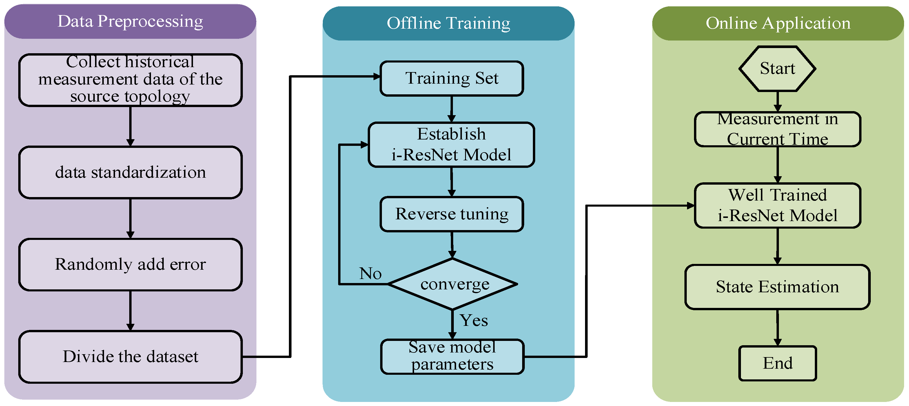 Once the i-ResNet model structure is designed, the overall architecture of the proposed i-ResNet-based distribution network state estimation is illustrated in Figure 4. It consists of several components: data preprocessing, offline training of the i-ResNet model, and online implementation. Each element is explained below.