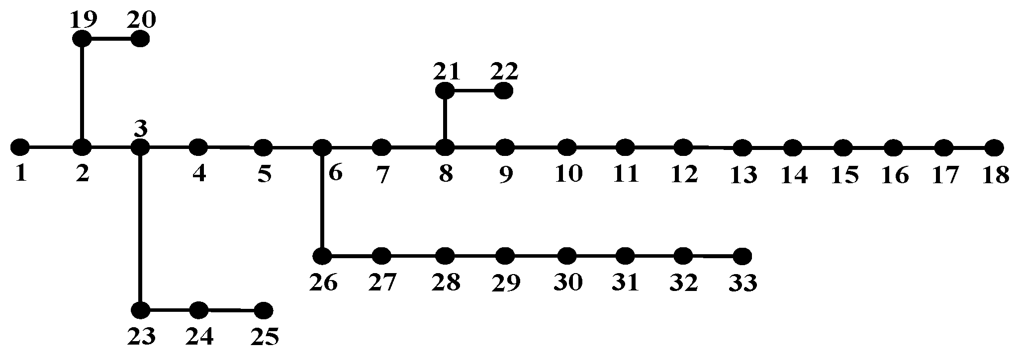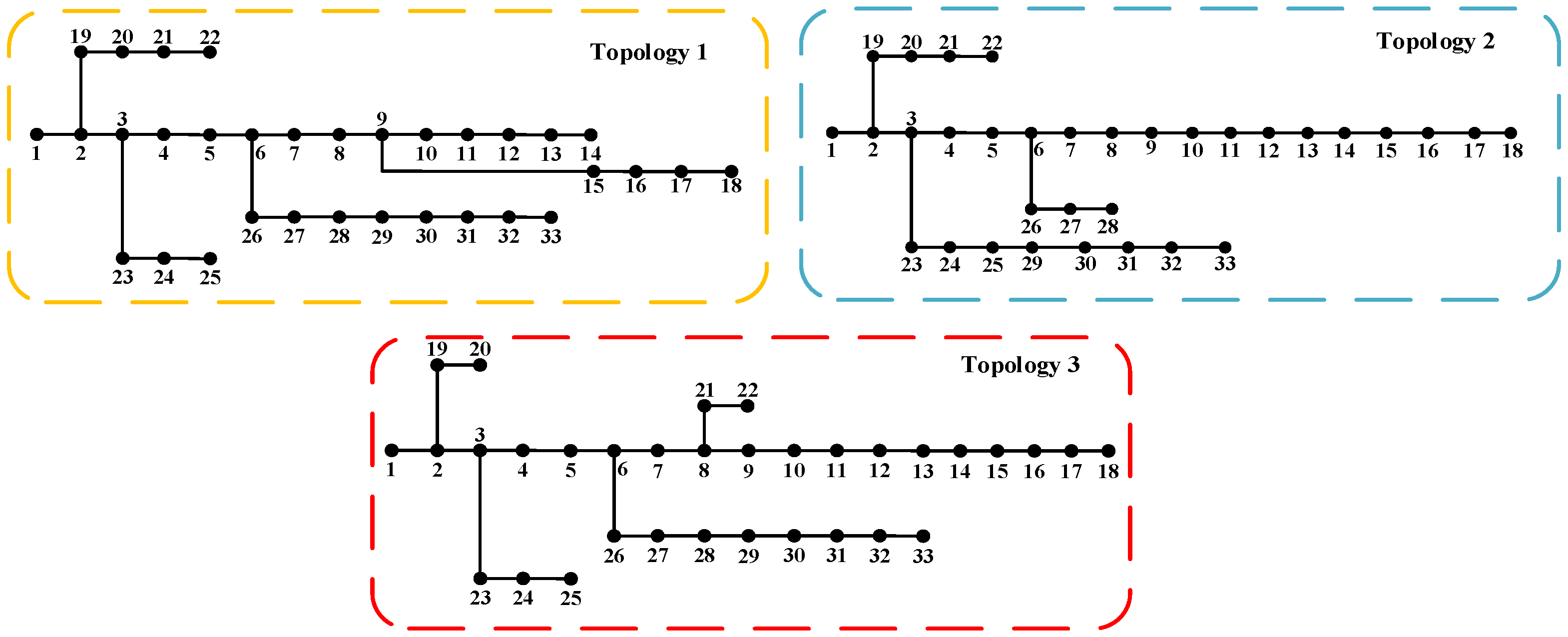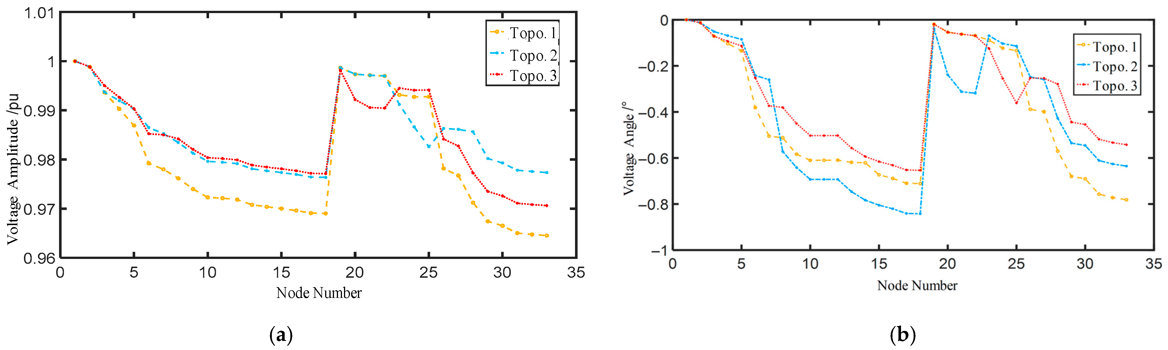 Using the IEEE 33-bus system as an example, Figure 5 illustrates three distinct topological configurations. At the same time, Figure 6 compares their operational states—specifically, node voltage magnitudes and phase angles, which are the state variables considered in this work—at a specific moment.