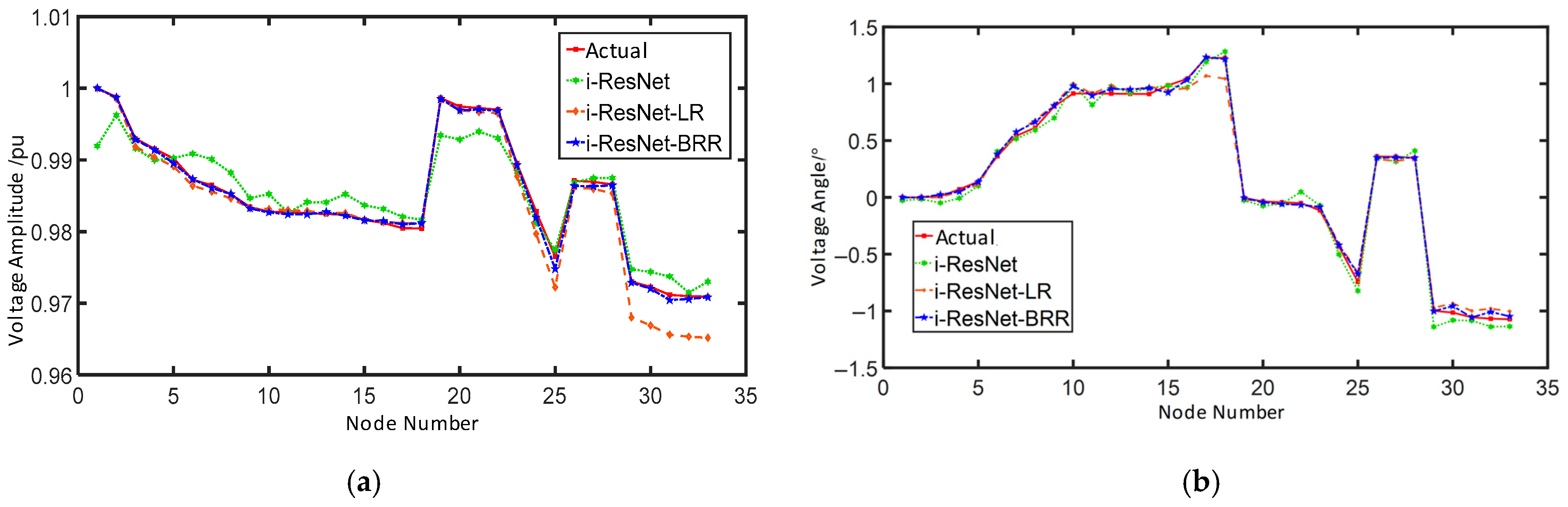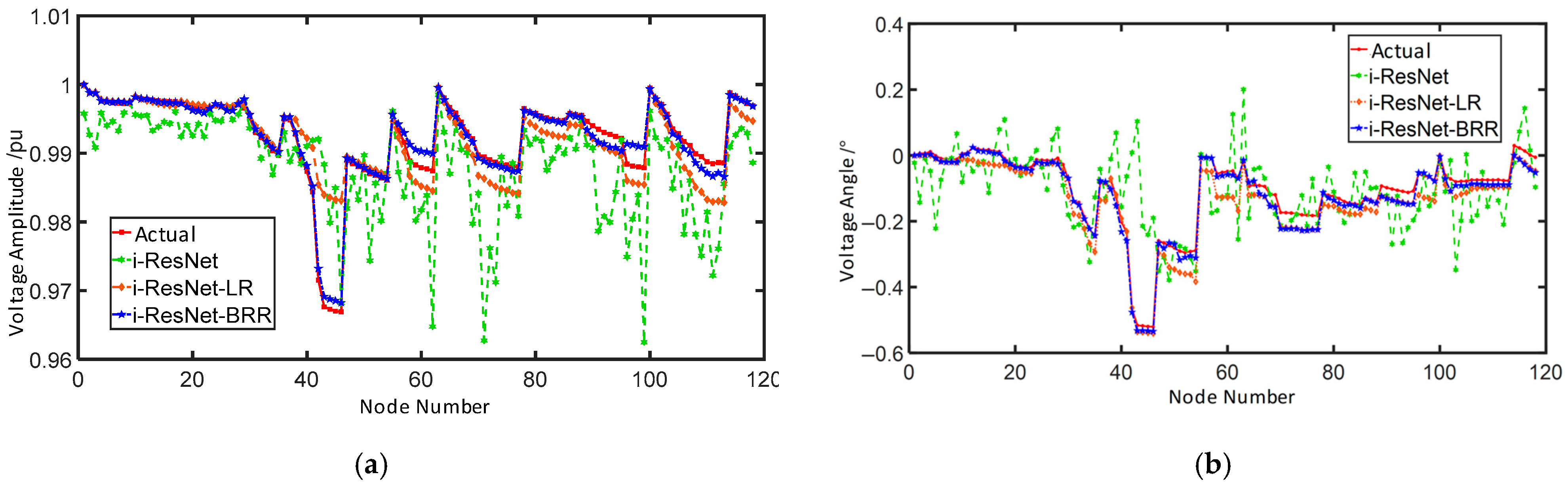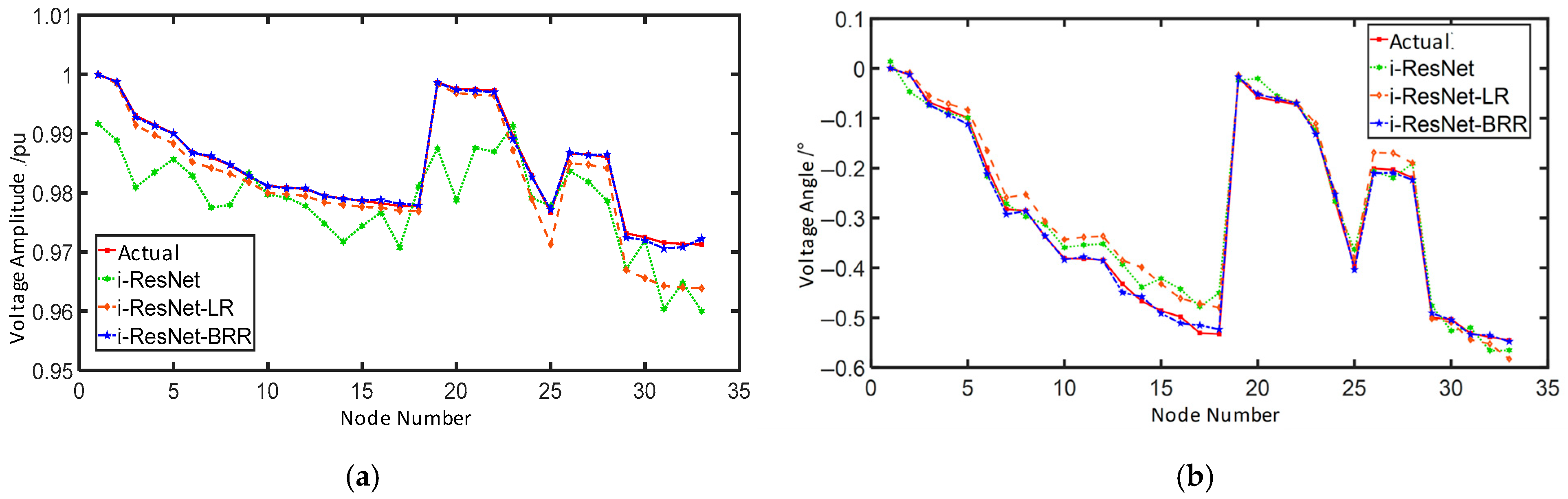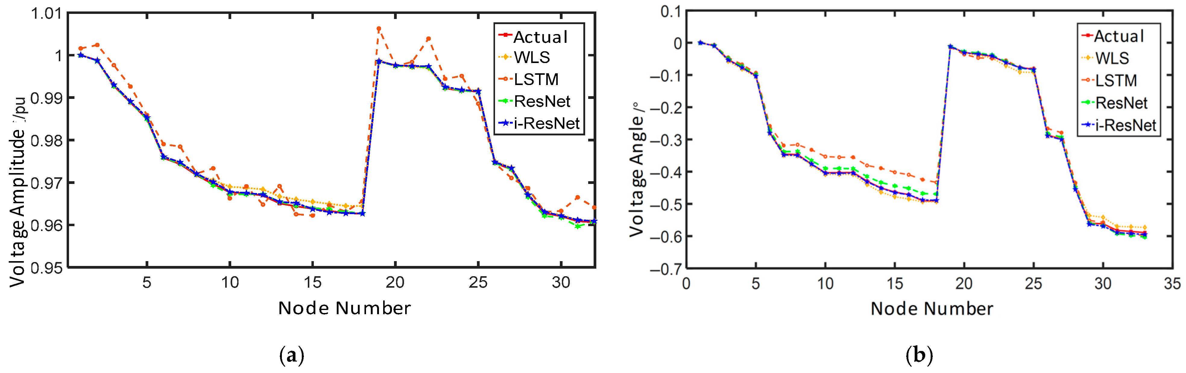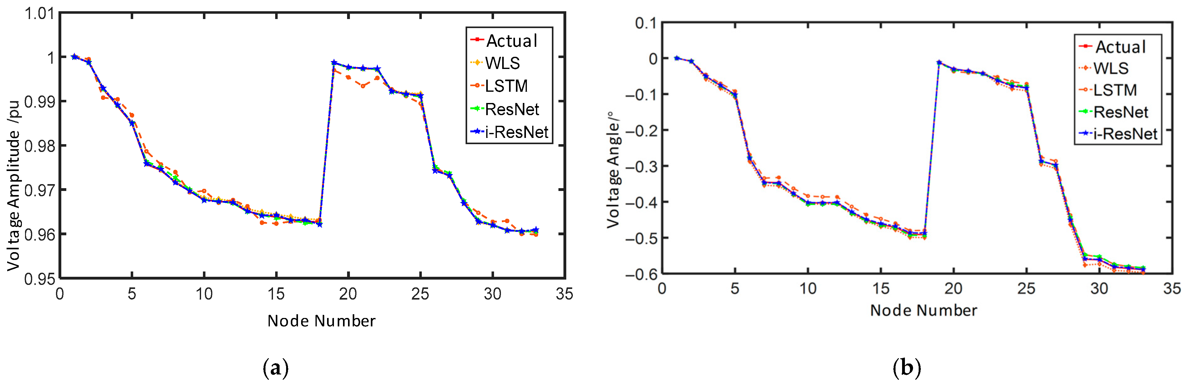With the increasing adoption of various machine learning algorithms, applying artificial intelligence techniques to solve complex power system issues, including state estimation, has garnered growing research interest. Data-driven AI methods analyze the nonlinear relationships between measurement vectors and state variables using historical data to develop models tailored to the data. These methods significantly improve the accuracy and robustness of state estimation, making them a popular research area. This field includes directly modeling the relationship between input measurements and output state variables with data-driven models and using these models to support physics-based solutions. For example, Ref. [18] used historical data and associated states to learn the mapping from current measurements to state variables. By inputting current measurement data into the trained model, an estimate of the current state is obtained. Similarly, Refs. [23,24] combined distributed local measurements with polynomial regression to estimate system voltage magnitude and phase angle, requiring a measurable controller in the distributed energy resource system as input. Reference [25] proposed a fast state estimation method suitable for large systems, where neural networks output node voltage magnitudes and phase angles, with measurements such as branch power, which have strong correlations, serving as inputs selected through correlation analysis. After offline training, the model can generate voltage estimates from measurement data in online operation, although the varying inputs for each node increase the complexity of training. In [26], a deep ensemble approach was introduced to enhance training stability by combining models with linear regression to reduce uncertainty. Meanwhile, Refs. [27,28] employed neural networks to explore the relationship between measurements and state variables, providing initial estimates for Gauss–Newton methods. Given the vast data in distribution network databases, extracting valuable insights and utilizing data-driven methods for state estimation has become a key research focus.