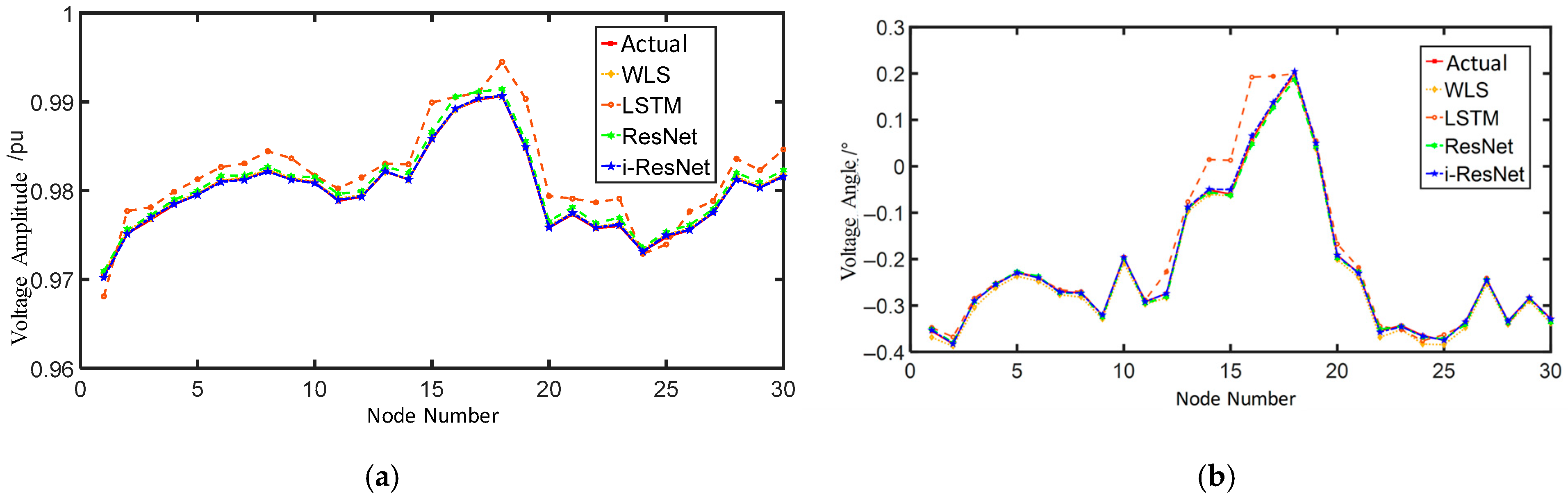 Figure 16. Node Voltage Estimation Results for Target Topology 2. (a) Voltage Magnitude; (b) Voltage Phase Angle.
