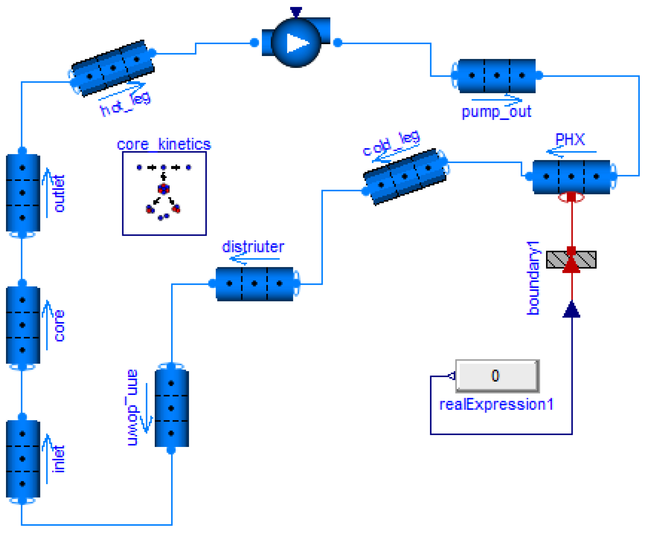 Figure 5. The circuit comprises the reactor vessel, pump, primary heat exchanger (PHX), and interconnecting piping. In the modeled flow path, the fuel salt circulates upward through the reactor core, discharges into the outlet plenum, and is then propelled sequentially through the hot leg, the main pump, and the discharge section into the PHX for cooling. The cooled salt returns via the cold leg, passes through the annular distributor, and descends through the downcomer into the core inlet plenum, completing the circulation loop upon re-entering the reactor core.