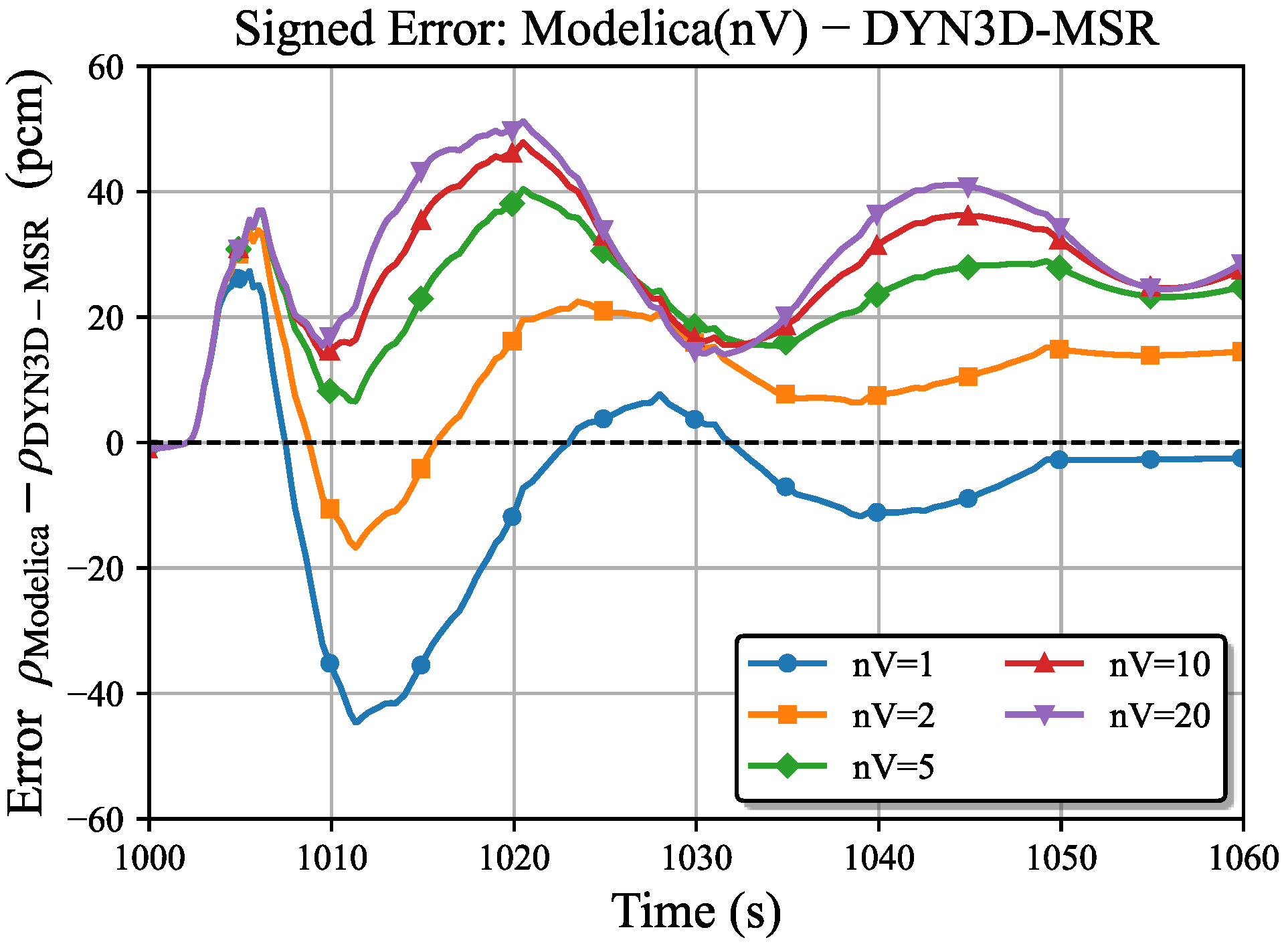 Figure 8, finer axial meshes better resolve the transport of DNP, leading to larger transient oscillations and stronger compensation. This behavior is due to the averaging assumption within the control volume. A coarser mesh assumes uniform DNP concentration within each cell, which under-resolves the DNP concentration gradient and underestimates the convective transport rate driven by fluid motion. As a result, DNP concentration is overestimated, leading to less compensation by the control rods. The signed error curves in