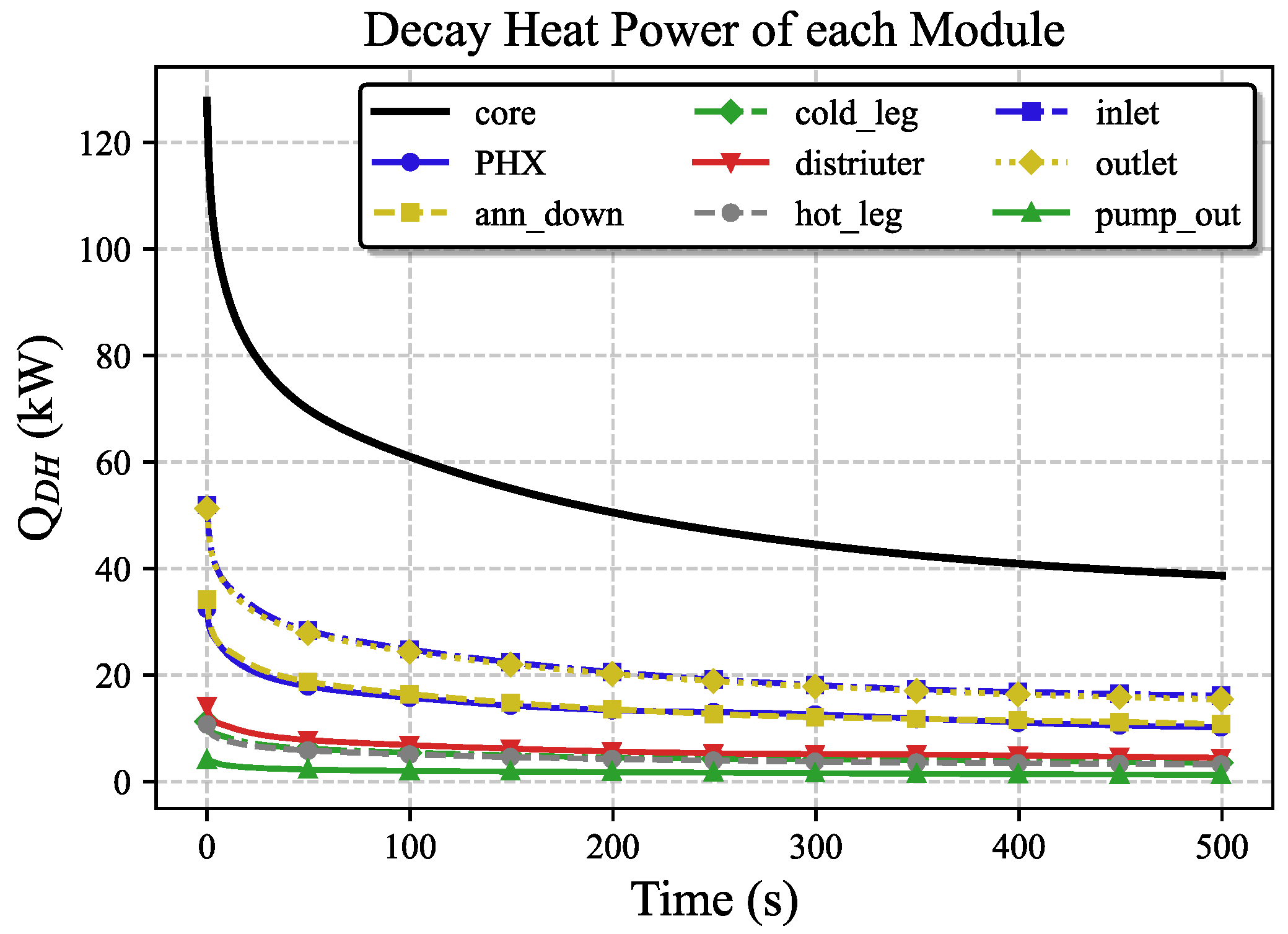 Figure 13, the pump maintains its nominal speed for 10 s and then linearly decelerates to a complete stop within 100 s. The flow rate decreases accordingly and stabilizes at a low level driven by natural circulation. The decay heat evolution of each component is presented in