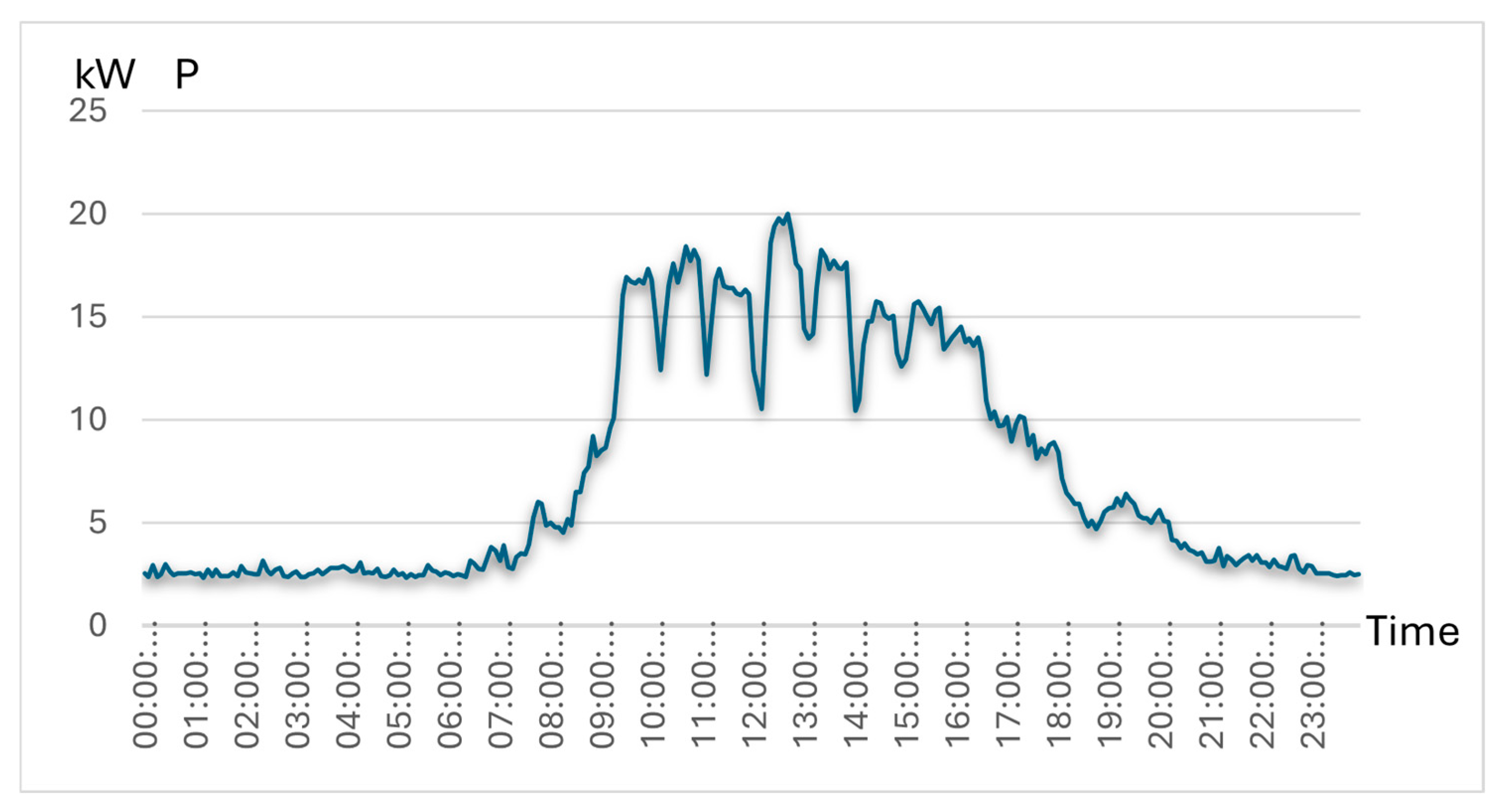 Figure 1. The maximum value reaches 20 kW, with a noticeable increase in power demand around 8 a.m. when the school starts classes, and visible drops in power consumption every 45 min during the day in line with the school’s daily rhythm and the switching off of lighting in classrooms during breaks.