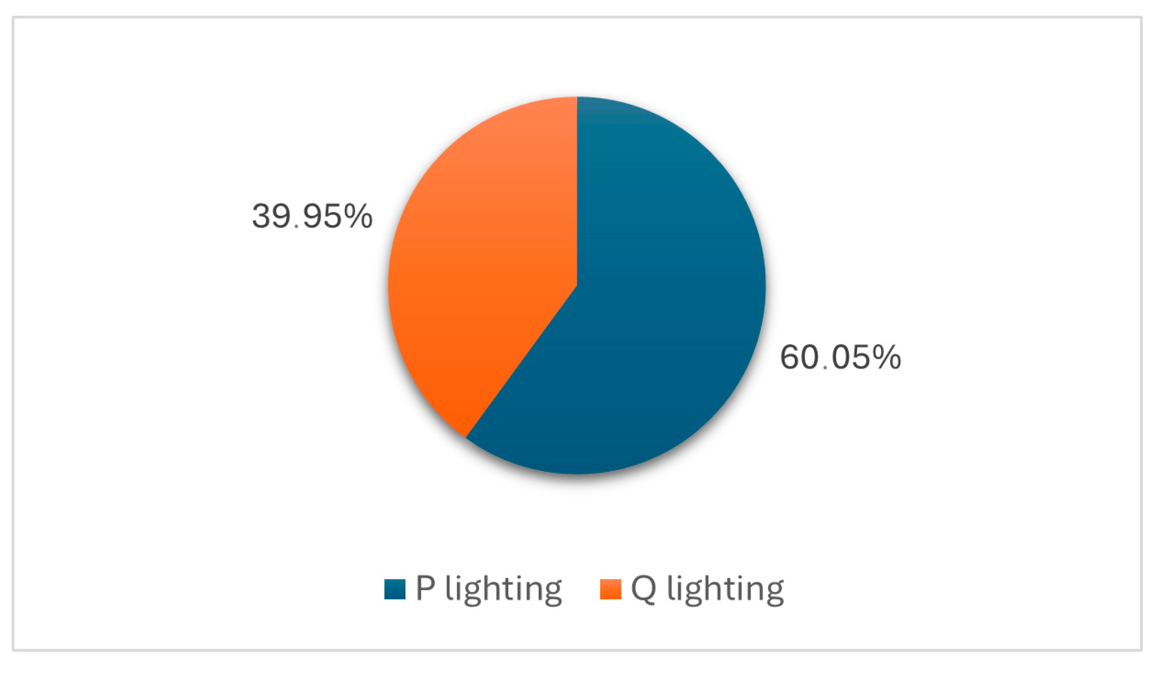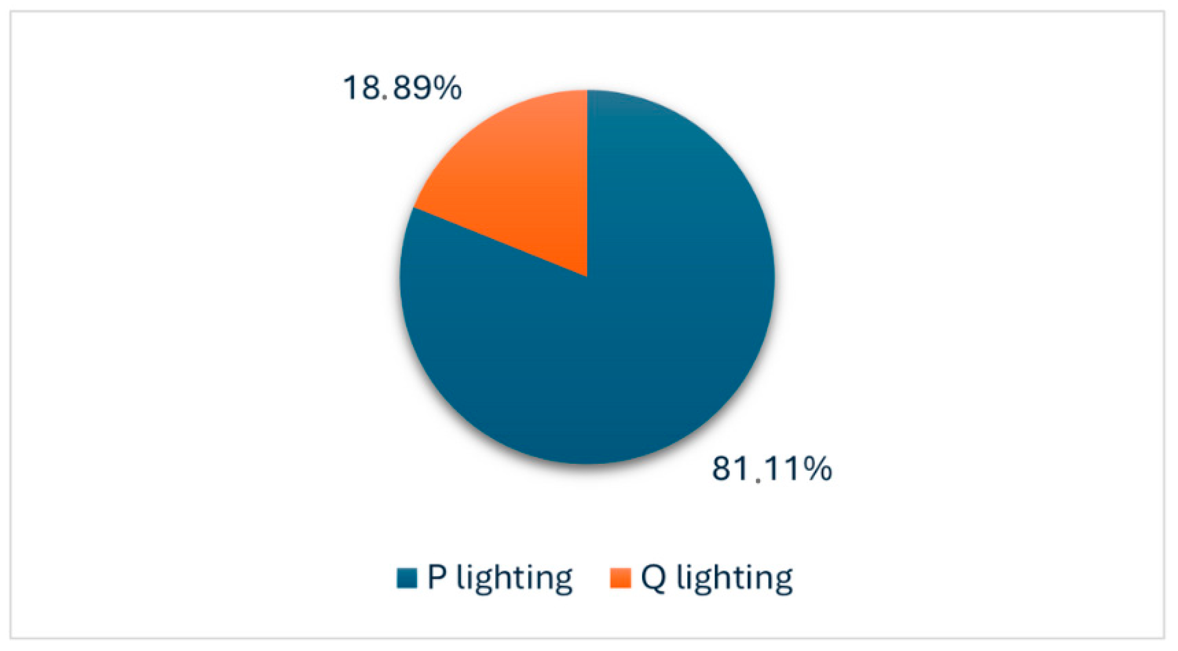 Figure 4 presents the percentage distribution of active and reactive power consumption for lighting in SB2.