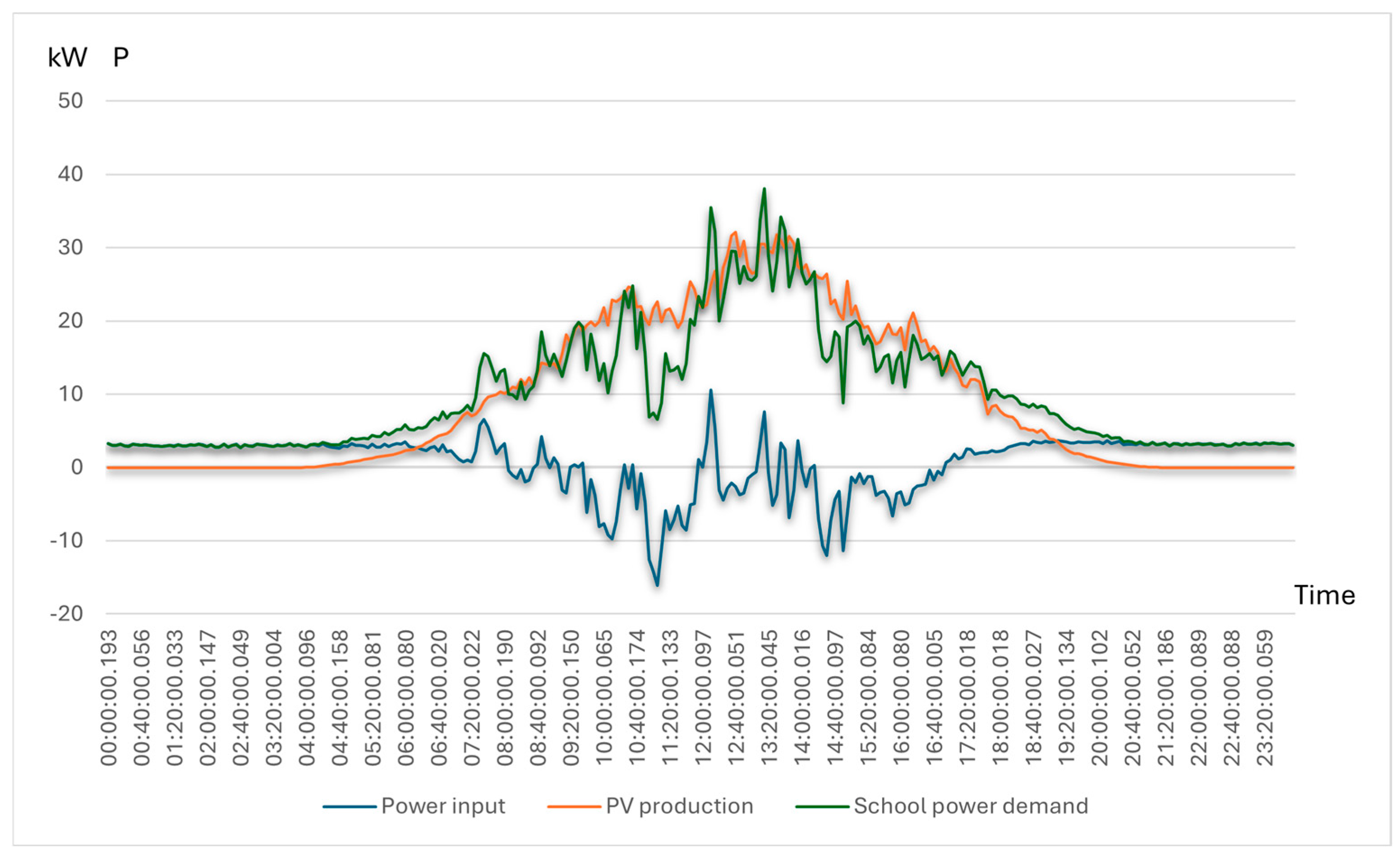 Figure 3 shows the daily power demand, production from the photovoltaic installation, and the resulting power consumption in school 2. Negative active power values are noticeable, which means that the photovoltaic installation produces more electricity than is needed, and the excess energy goes to the grid. There are also noticeable spikes in active power demand, which may be caused by changes in weather conditions, e.g., cloud cover, when the photovoltaic installation does not produce electricity.