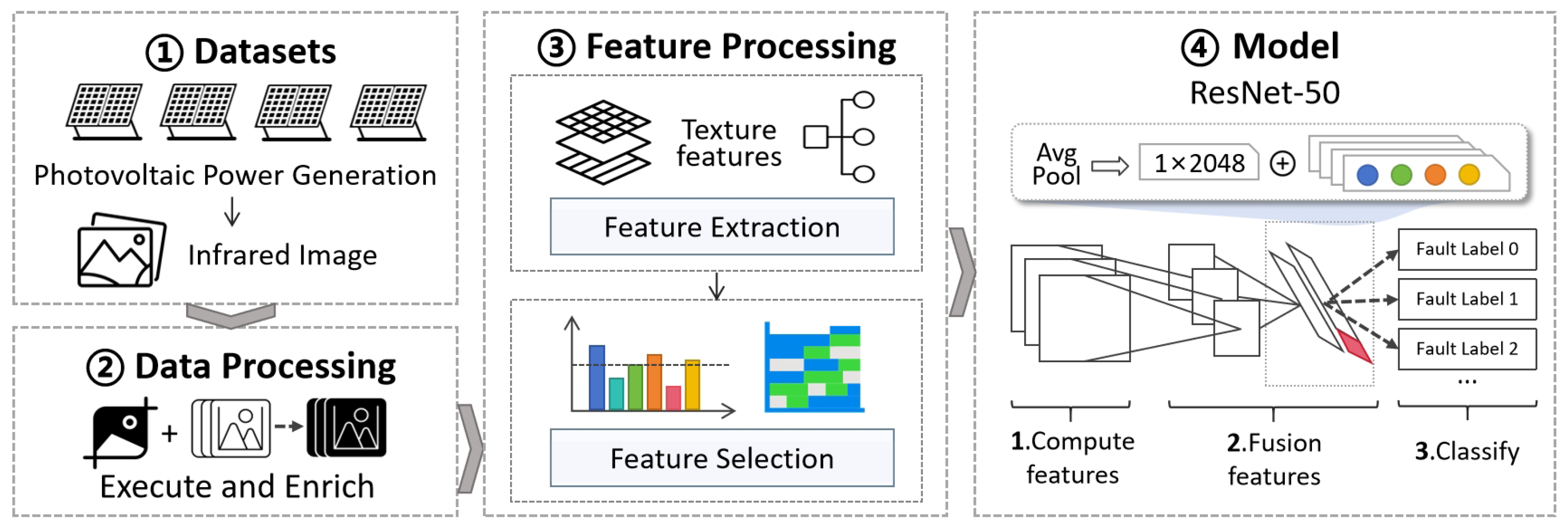 Figure 3, encompassing the entire process from data preprocessing, texture feature extraction, and deep feature calculation to feature fusion and classification. This framework effectively integrates texture features with deep learning models, offering a novel approach to fault classification in photovoltaic modules. Experimental results demonstrate that the proposed method not only excels in classification accuracy but also exhibits strong model robustness, adapting well to diverse photovoltaic fault scenarios.