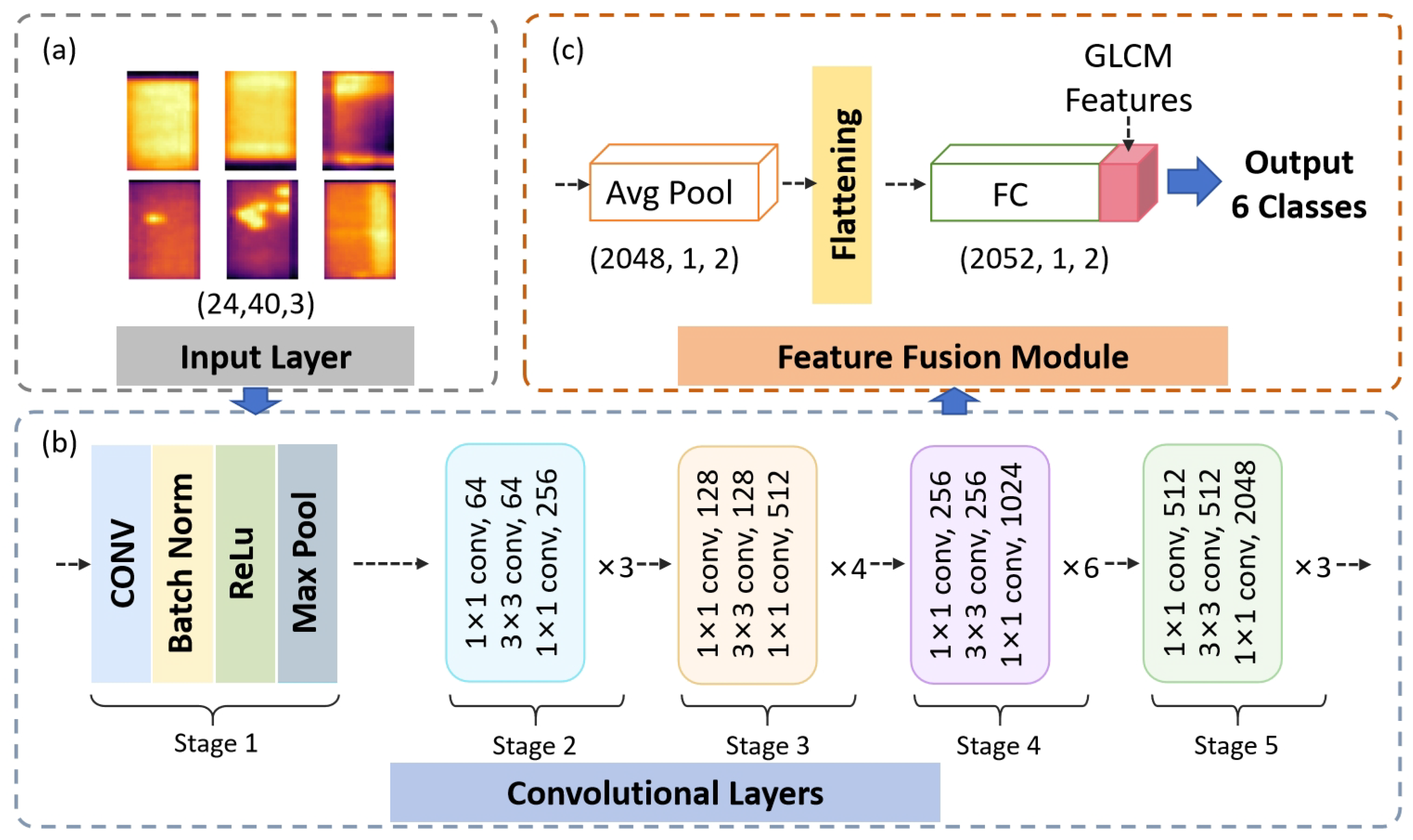 18] have shown that ResNet50 exhibits strong generalization ability in PV image analysis tasks. Furthermore, we optimized the ResNet50 architecture by integrating texture features, enhancing the model’s robustness and improving its ability to recognize complex fault patterns.