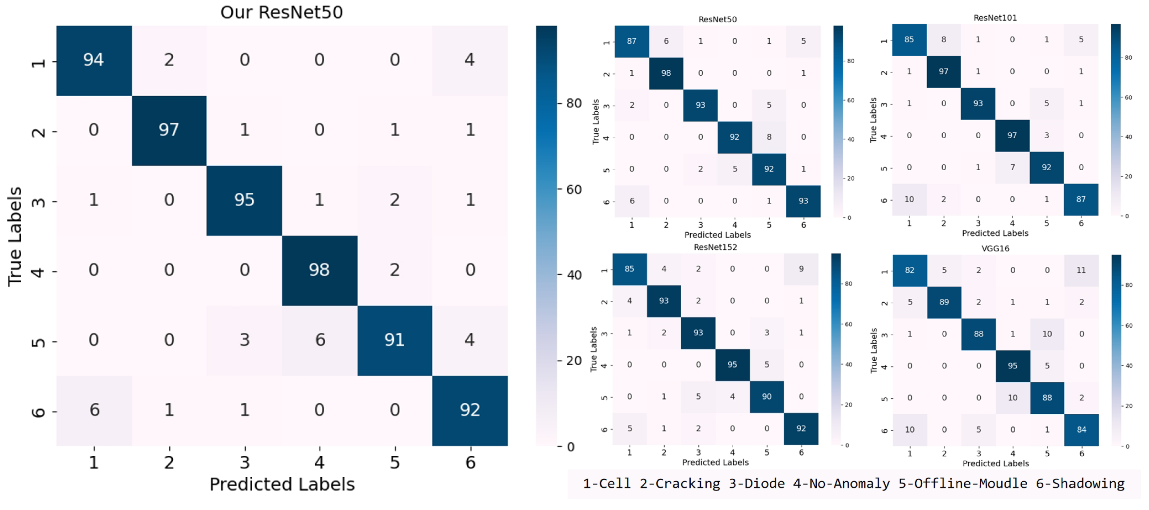 Figure 6 presents the confusion matrices obtained by our ResNet50 model and existing models when performing fault classification on the test set. The vertical axis represents the actual fault types, while the horizontal axis represents the predicted results. The fault types include cell, cracking, diode, offline-module, and shadowing. The depth of color in the corresponding positions of the matrix indicates the number of correctly classified samples. Brighter colors represent a higher number of correctly identified samples, thereby indicating higher model accuracy.