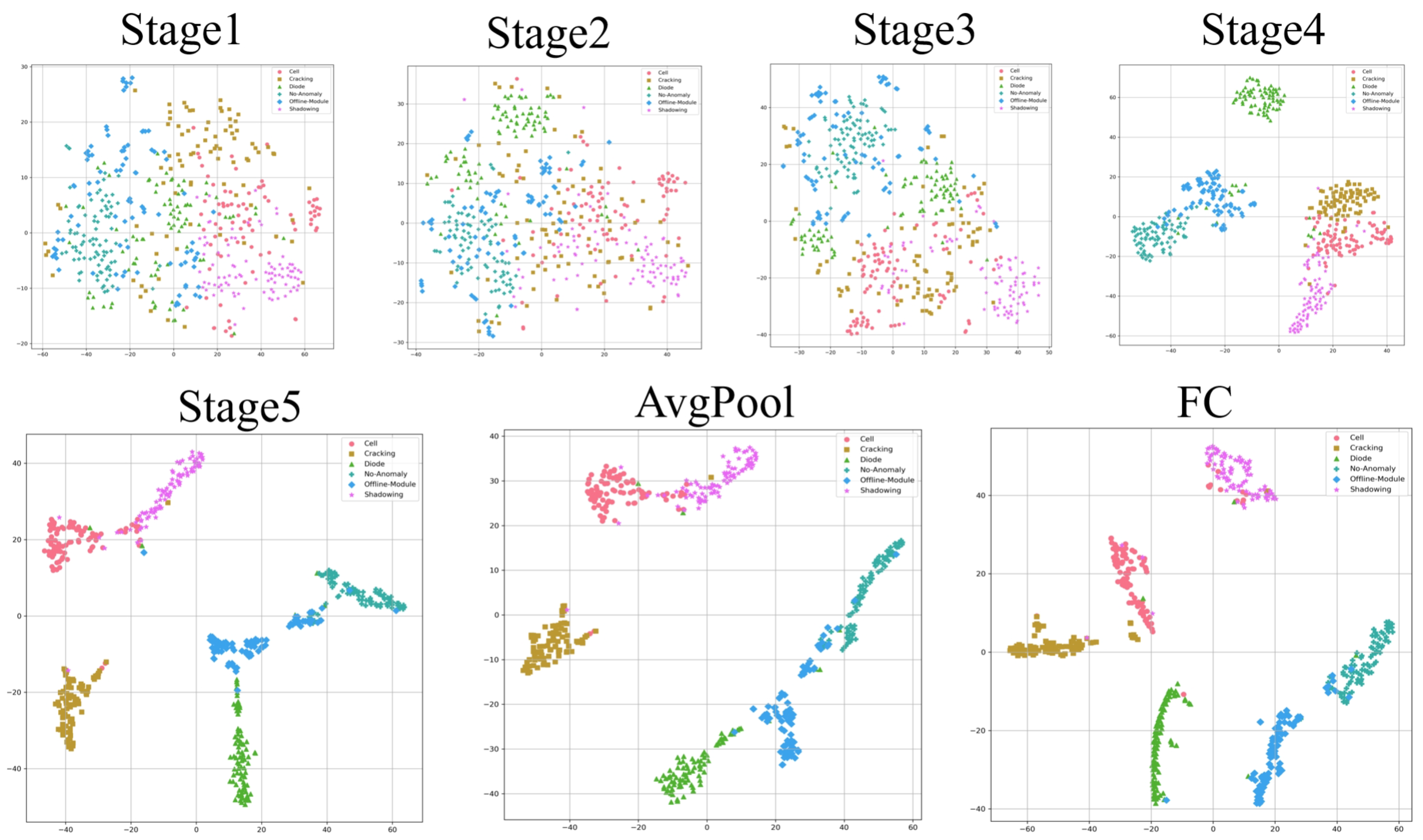 This paper further analyzes the feature classification behavior using the t-SNE algorithm based on the infrared image dataset of photovoltaic modules and the improved ResNet50 model designed in this study. The high-dimensional output prediction data is visualized in a two-dimensional plane.