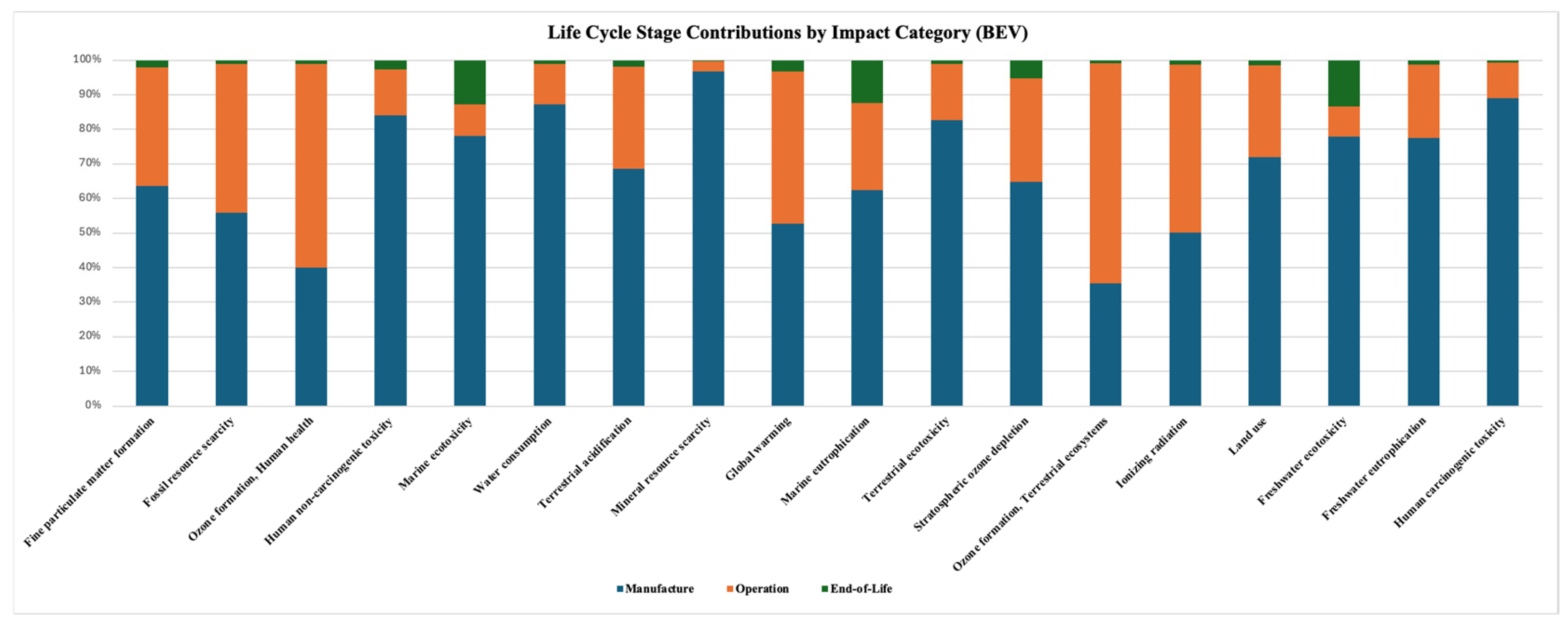 43]. Systematic reviews further emphasize that material production, particularly for batteries, and the treatment of end-of-life processes remain critical contributors to BEV impacts [