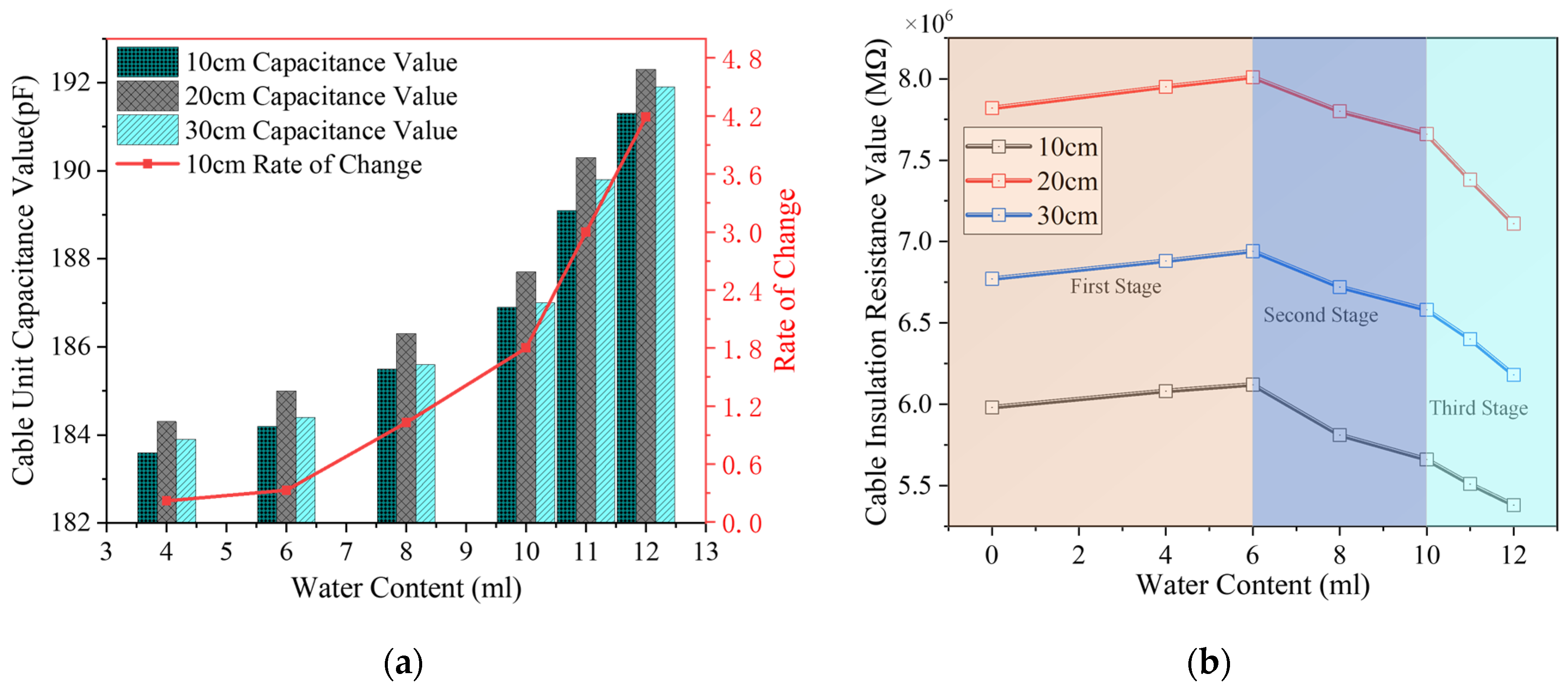 Figure 3a. The initial capacitance values of the 10 cm, 20 cm, and 30 cm cables are 183.2 pF, 183.9 pF, and 183.54 pF, respectively. In the first stage of moisture absorption, the water-blocking tape rapidly absorbed moisture, resulting in no significant change in cable-body capacitance. After the moisture content reached 6 mL, the cable entered the second stage of moisture absorption, which the capacitance increased steadily by approximately 0.7% for every additional 2 mL of moisture. An additional 1 mL of moisture from 11 mL to 12 mL led to moisture penetration into the main insulation, indicating a transition to the third stage of moisture absorption, at which point the capacitance surged sharply.