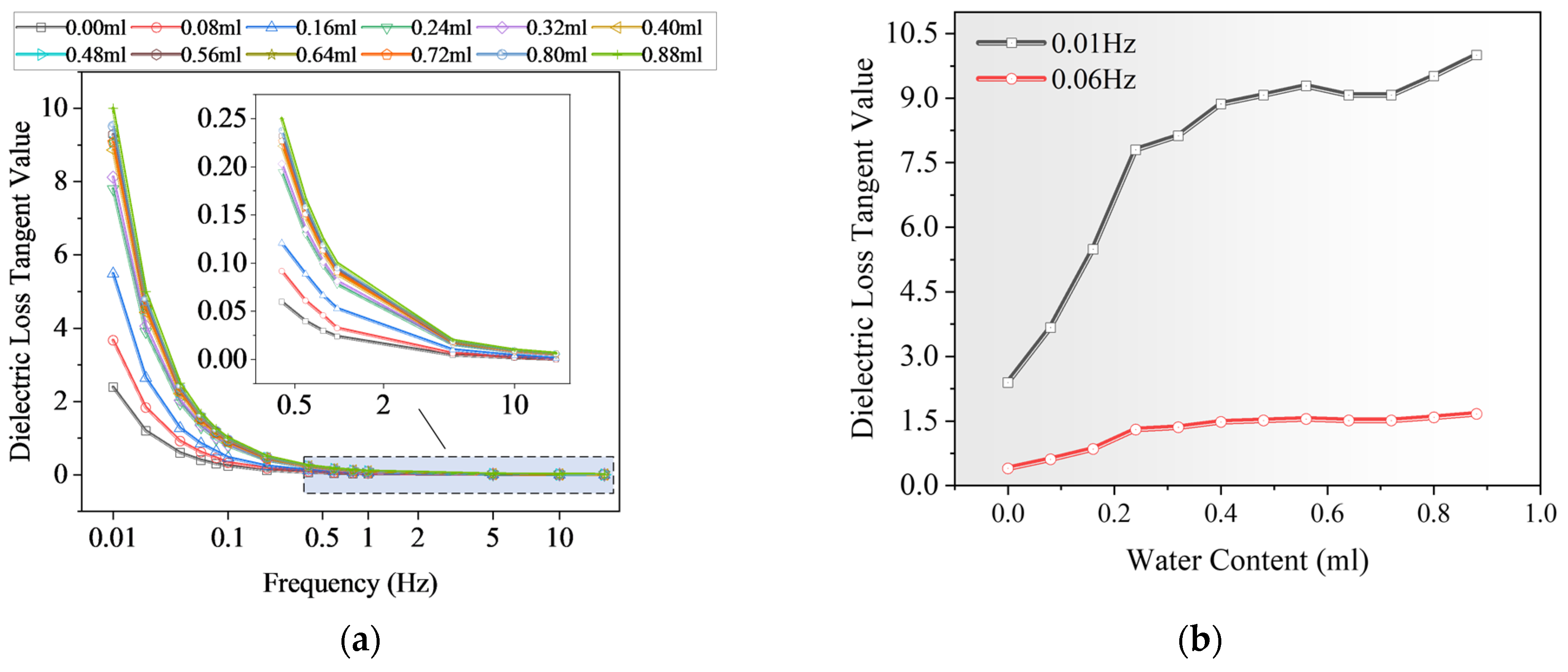 Figure 5b shows the influence of the moisture content on the dielectric loss at 0.01 Hz and 0.06 Hz. It can be observed that the dielectric loss at low frequencies was several times higher than that at high frequencies. Therefore, in actual on-site measurements, under the condition of filtering out external high-frequency interference signals, using a lower frequency makes it easier to detect the moisture absorption status of the main insulation of the cable and to determine its moisture absorption level.