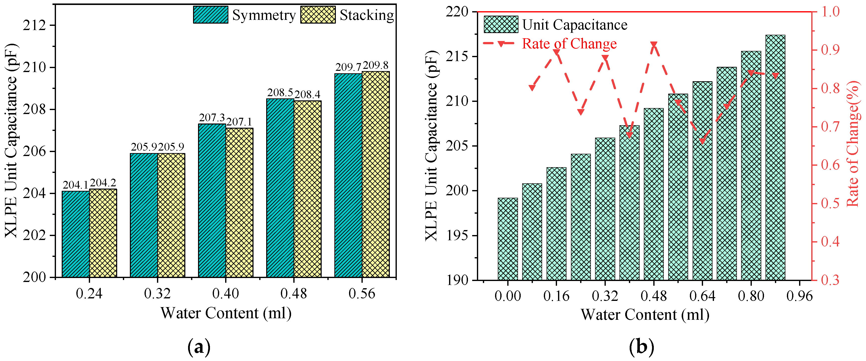 Figure 6b. When the moisture content increases by 0.08 mL, the measured average growth rate of the unit length XLPE capacitance was 0.79%.