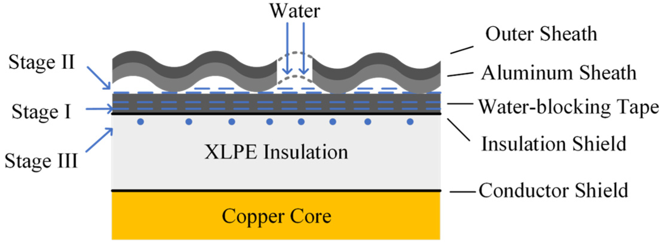 6]. Conversely, the intrusion of a large amount of water may diffuse into the main insulation and induce water treeing, thereby accelerating the aging and degradation of the insulating material and even leading to insulation breakdown and power supply interruptions [