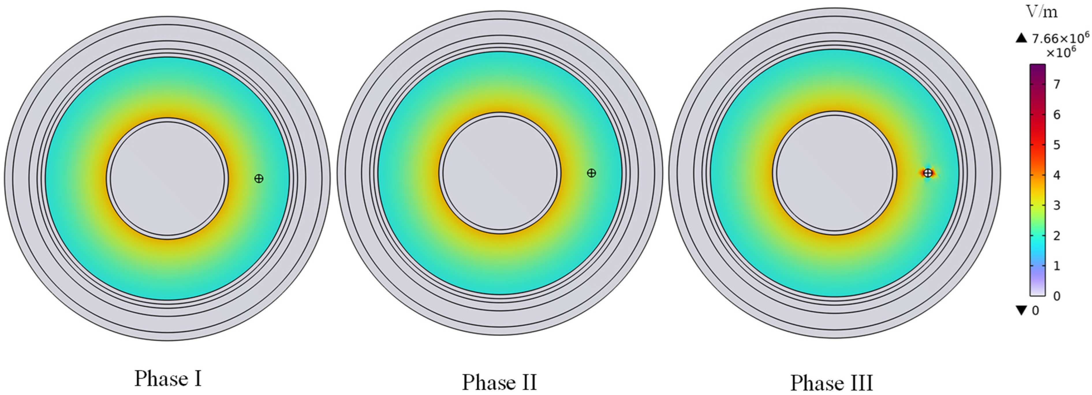 In the simulation process, the same moisture content as that of the test cables was used to investigate the variation in moisture absorption. The maximum electric field in the cable was simulated and calculated by adjusting the moisture content of the cable. The changes in the electric field strength within the cable indirectly verified the variation law of the three stages of the cable moisture absorption. As shown in