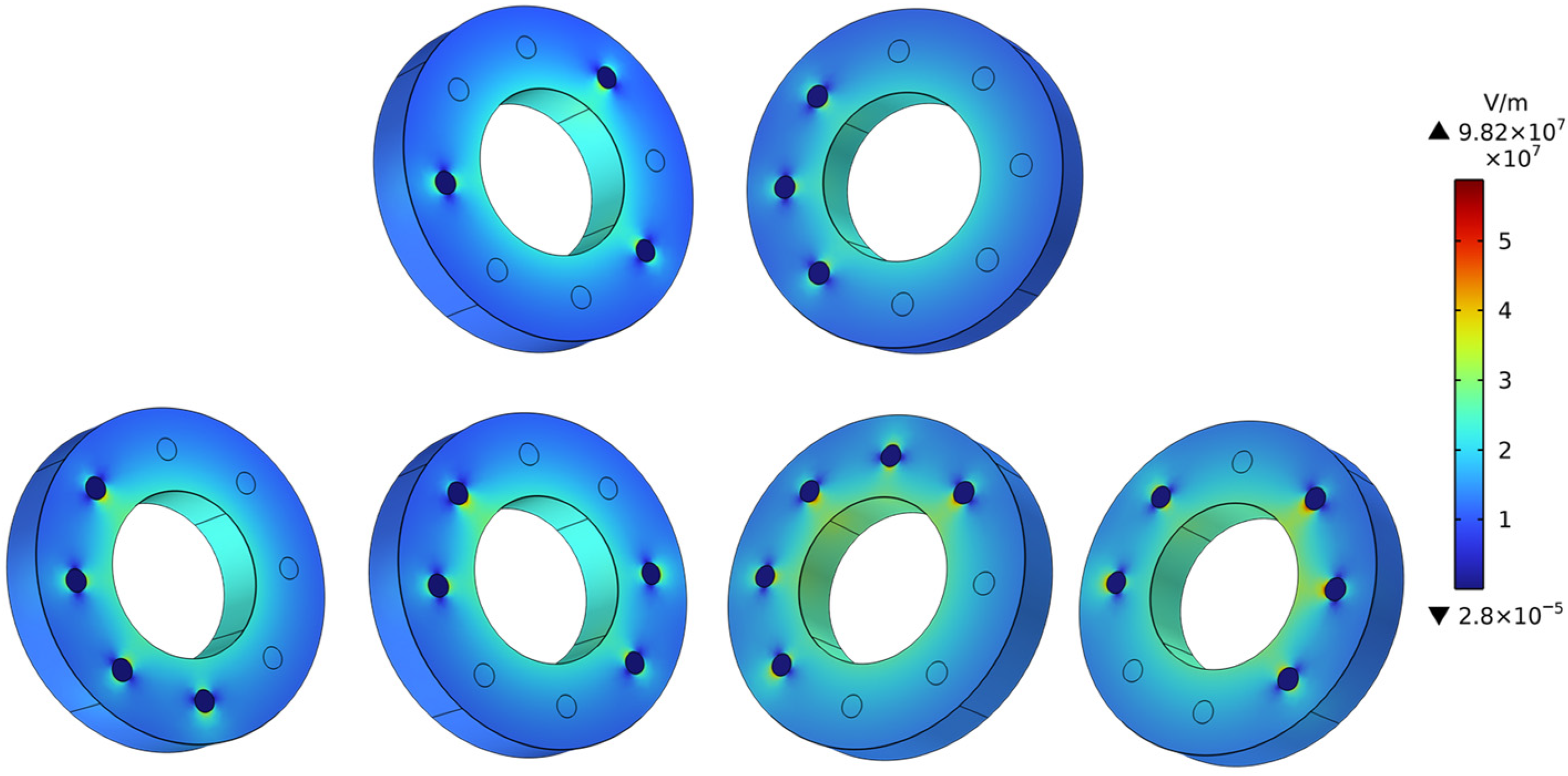 Figure 11 shows the electric-field distribution diagrams of the cable insulation after moisture absorption at different distribution positions. It can be observed that the maximum and minimum electric field values of the cable are essentially the same when they are subjected to accumulated moisture absorption or symmetric moisture absorption, and the electric field value gradually increases with the gradual intrusion of moisture.