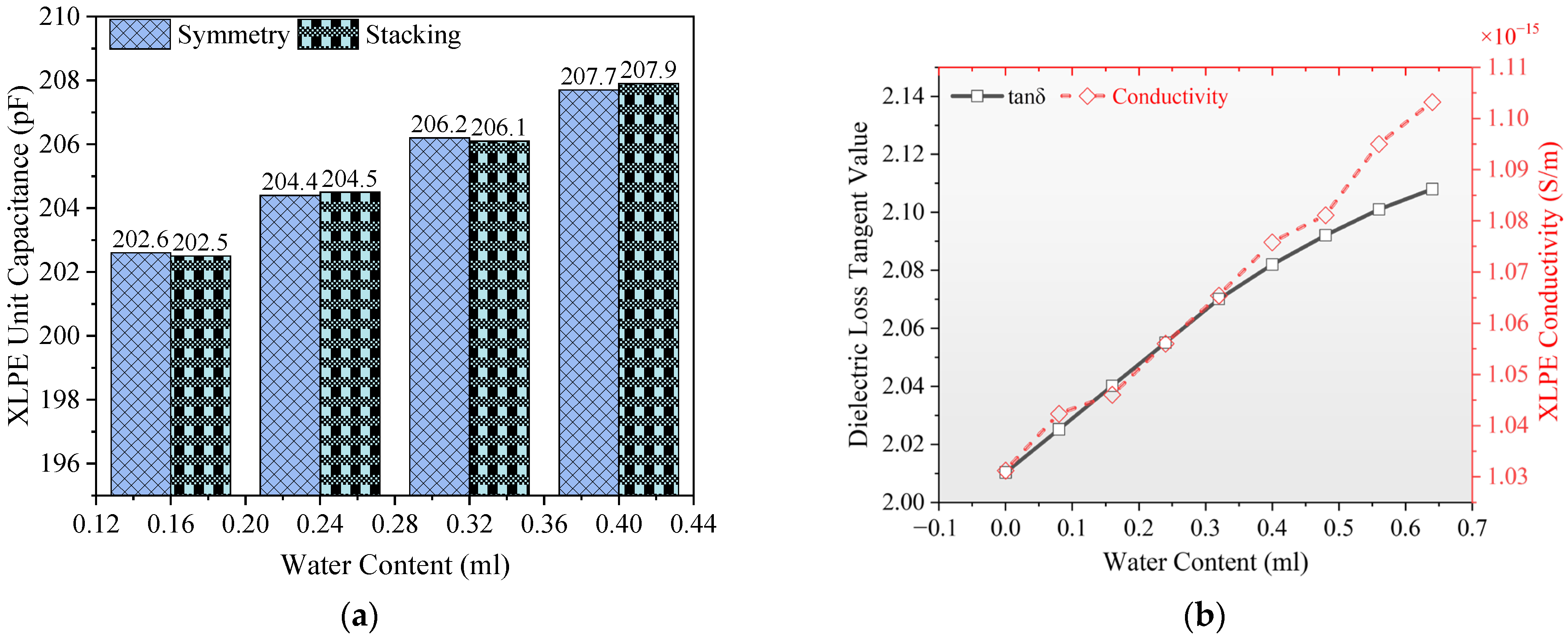 Figure 12a. It is observed that the capacitance values are essentially the same, regardless of the accumulated distribution or symmetric distribution. After moisture invades the cable insulation layer, owing to its high dielectric constant, it can produce a polarization effect under the action of an electric field, causing local electric field distortion and charge accumulation, as shown in