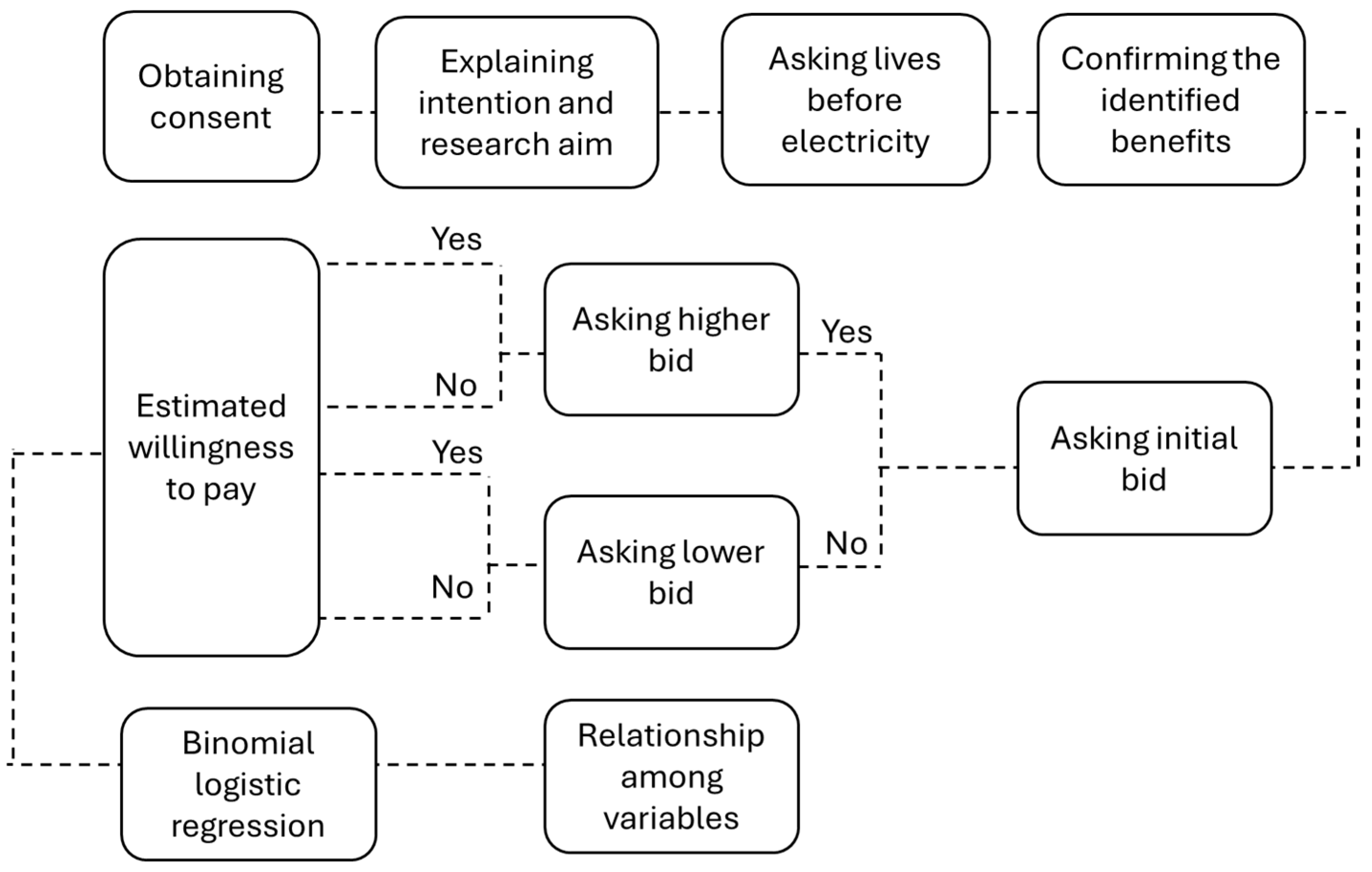 - c.1. If there were no electricity, would you be willing to pay 2000 Rupiah so that customary events could use electronic devices?—If the answer is yes, continue to c.2., if the answer is no, continue to c.3.