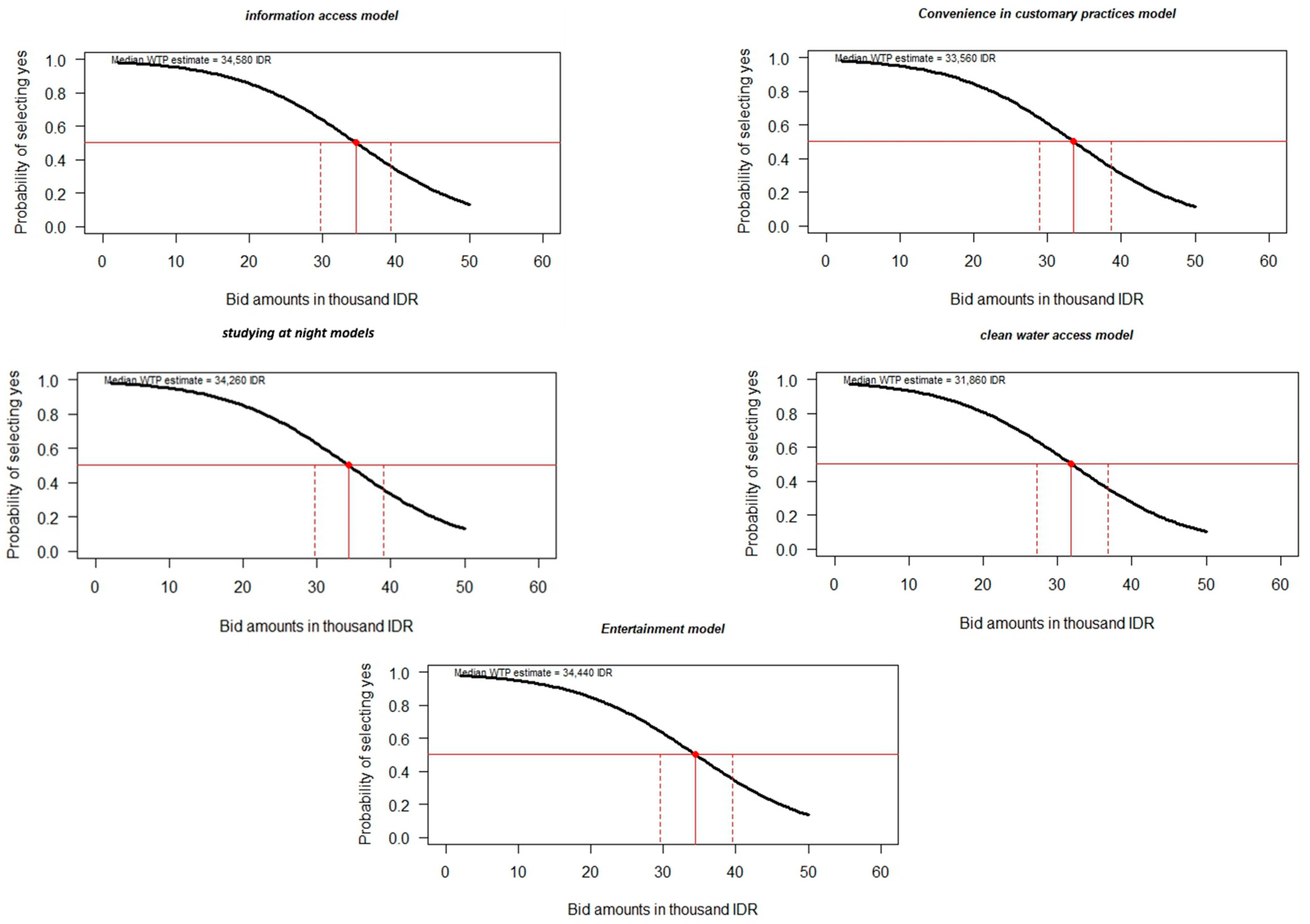 - e.1. If there were no electricity, would you be willing to pay 2000 Rupiah so that you could be active at night?—If the answer is yes, continue to e.2., if the answer is no, continue to e.3.