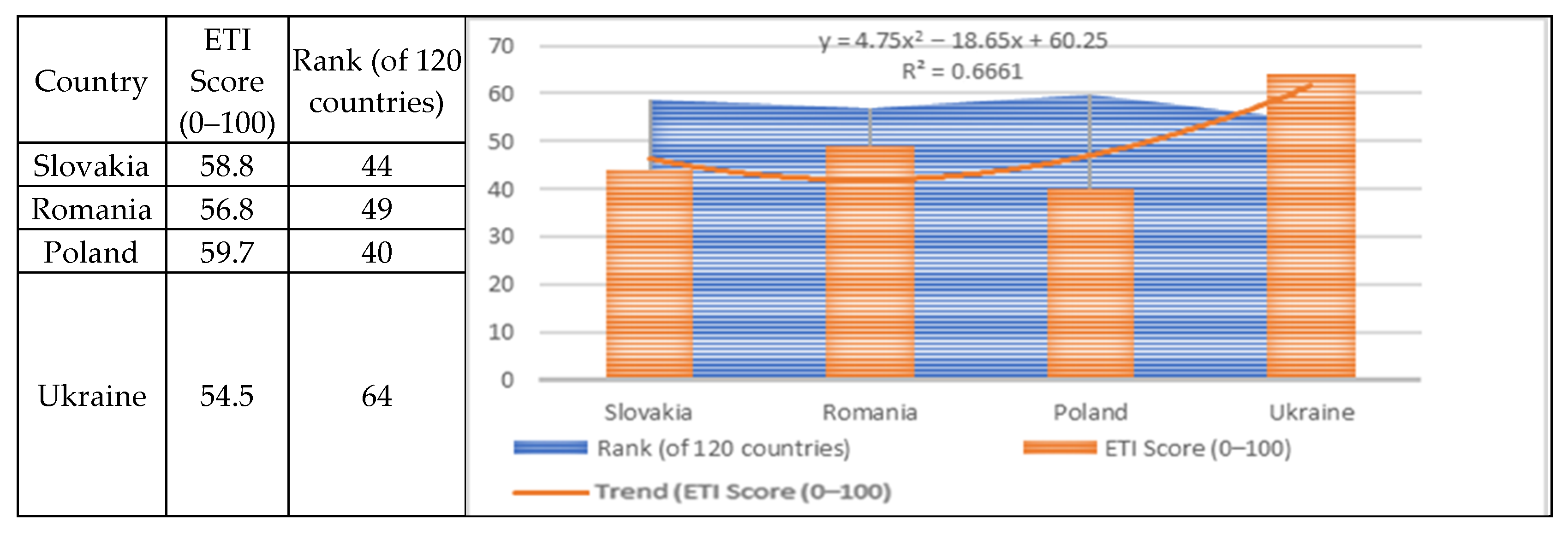The trend line illustrates the relationship between a country’s ETI score and its relative rank, where the regression equation and R2 value indicate the strength and direction of this association.