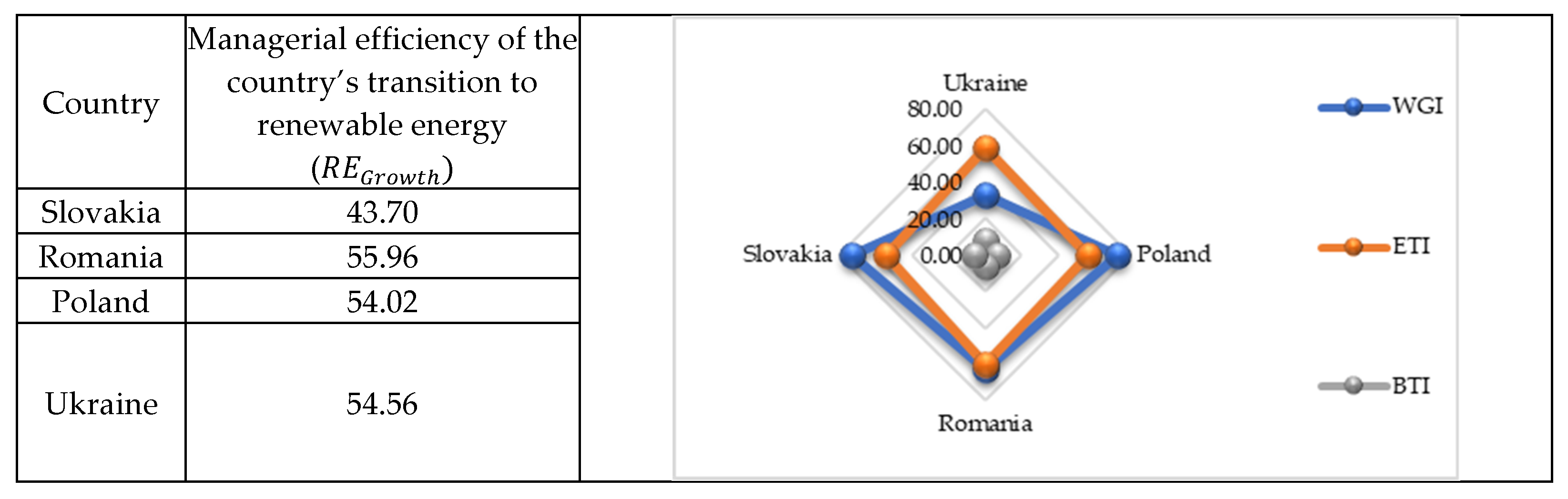 Figure 2 presents the results of an index-based assessment of Ukraine’s managerial effectiveness in the renewable energy transition, based on three key indices: the ETI, the WGI, and the BTI. For comparative context, Ukraine’s scores are contrasted with those of Poland, Romania, and Slovakia—EU member states that share similar historical backgrounds but exhibit different levels of progress in the renewable energy sector.