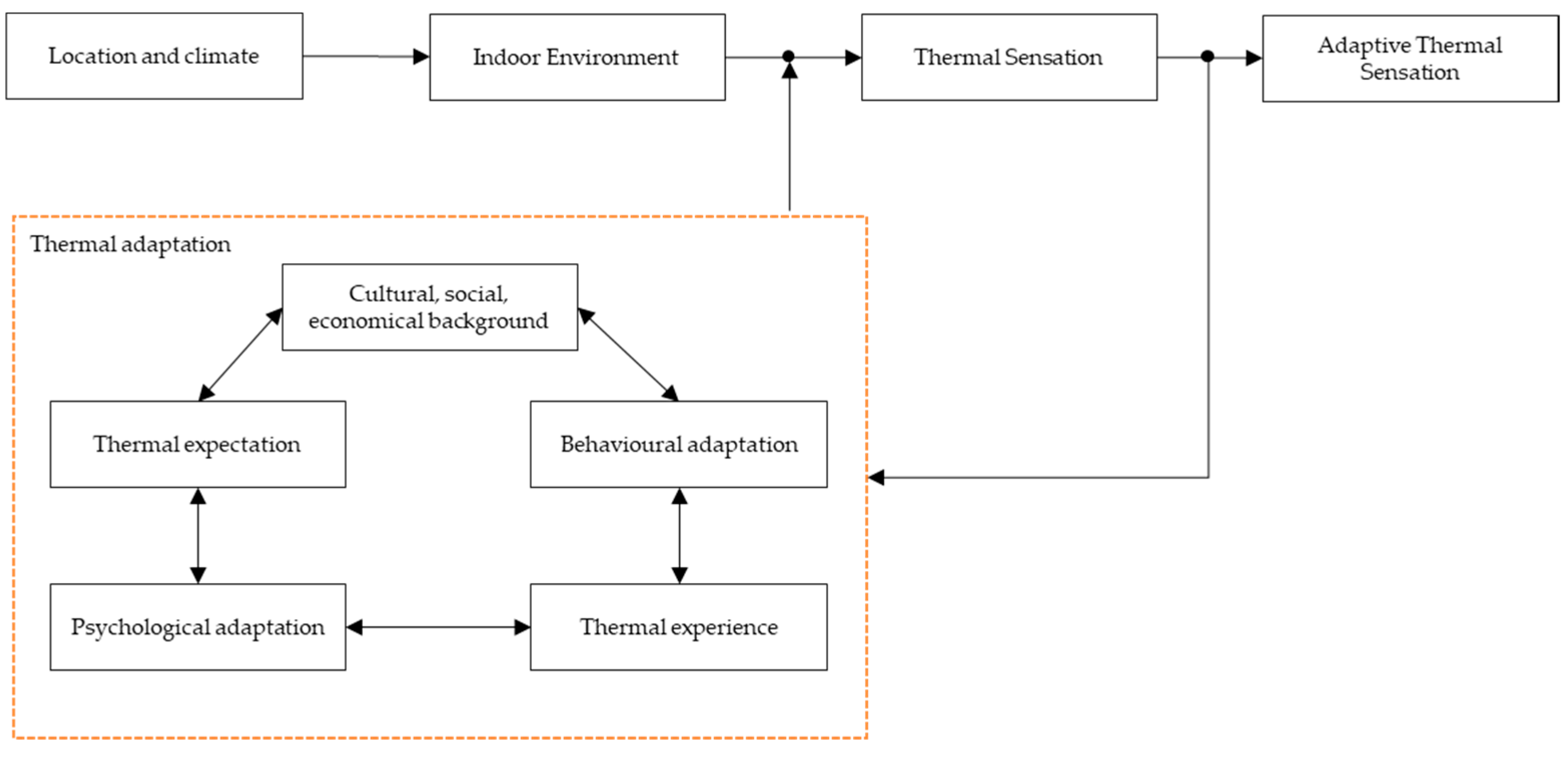 34]. This led to the development of adaptive thermal comfort models, based on the principle that occupants actively regulate their comfort through behavioural, physiological, and psychological adaptation mechanisms. The adaptive approach assumes a continuous feedback loop between environmental stimuli and human responses [