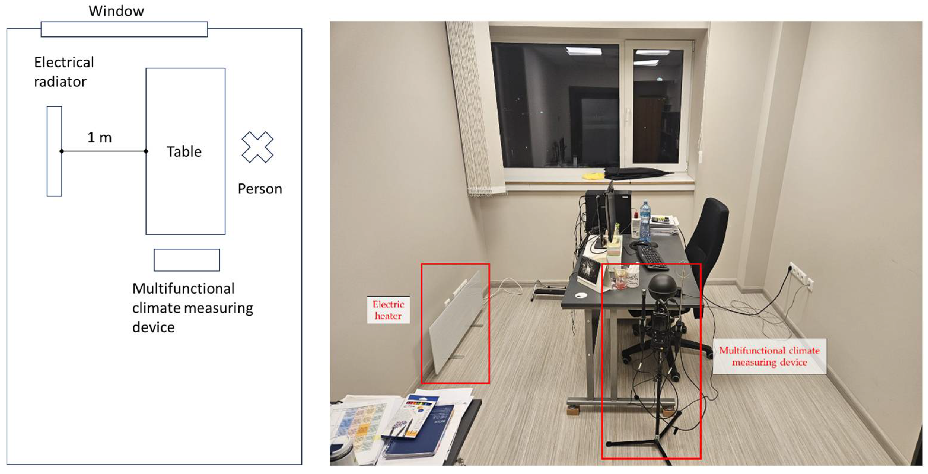 The experimental method is based on the controlled manipulation of indoor temperature during the occupied daytime periods using a stand-alone electric radiator that stands 1 m away from the person. The positioning of the radiant source, the person, and the measuring equipment replicates typical layouts encountered in occupied spaces. The central heating radiator in the room is kept off throughout the experiment to ensure that the thermal environment responds exclusively to the predefined setpoints of the controllable heater. By isolating a current single heat source, the experiment maintains a high level of reproducibility and avoids confounding effects caused by fluctuating building systems (See