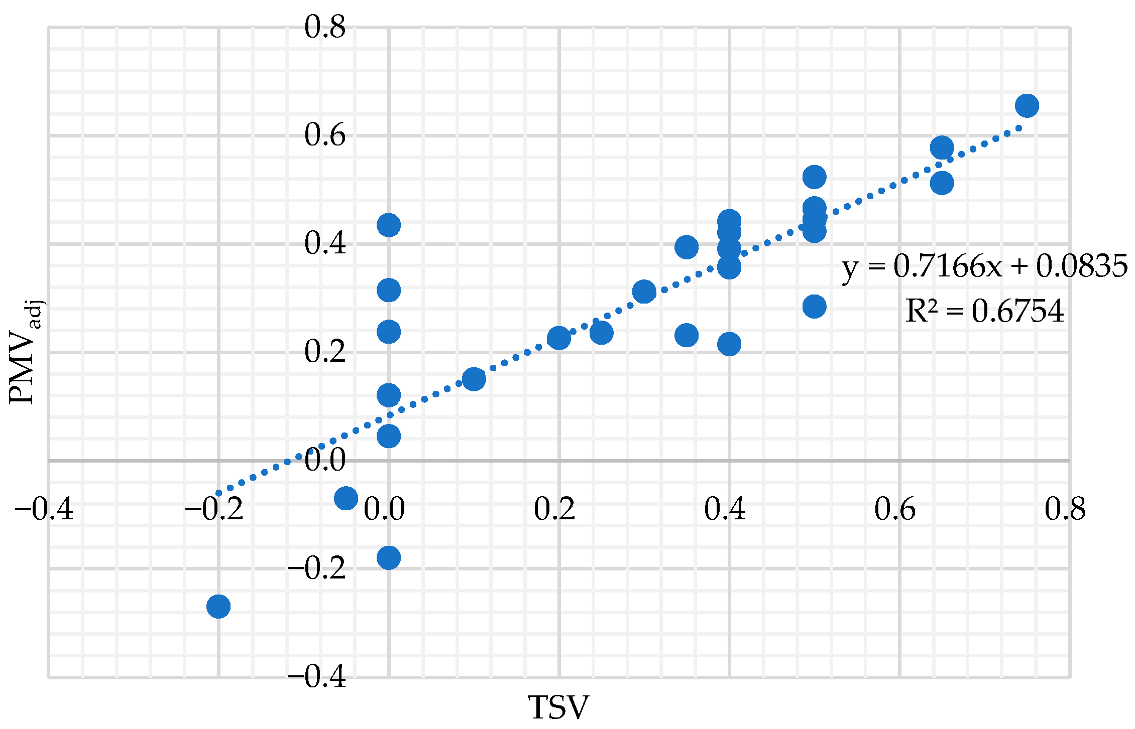 Introducing the dynamic adjustment, PMVadj, improves the agreement with TSV in terms of absolute error and explained variance. Compared to the PMV baseline, NRMSE decreases from 17.61% to 14.00%, which corresponds to an approximate 19% reduction in NRMSE. At the same time, the R2 coefficient increases to 67.54% and the Pearson coefficient also increases to r = 82.18%. Although this increase is slight, the reduction in NRMSE is practically important because it means the adjusted model tracks the typical magnitude of subjective deviations more closely. It means that PMVadj reduces the average distance to the reported sensation.