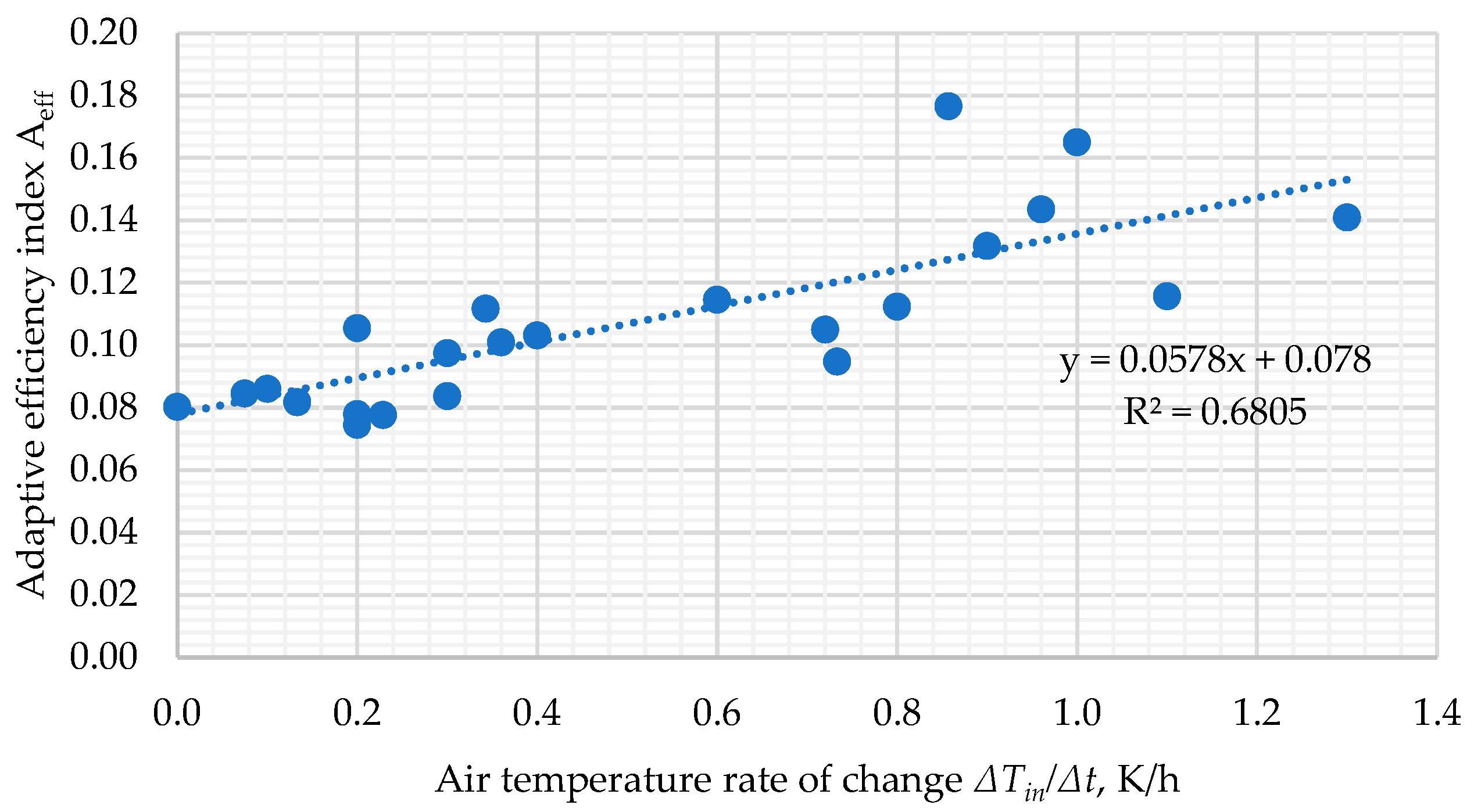 When indoor air temperature changes are close to quasi-steady, Aeff remains concentrated in a relatively narrow band. As ΔTin/Δt increases towards the upper range up to 1.3–1.4 K/h, Aeff increases accordingly up to 0.15. This behaviour is consistent with the underlying assumption of the index that temperature transients create a transient comfort perception that is not represented by a steady-state PMV calculation. Therefore, the strong association between Aeff and ΔTin/Δt demonstrates that the proposed adjustment is sensitive to real-time indoor thermal dynamics rather than only to absolute temperature.