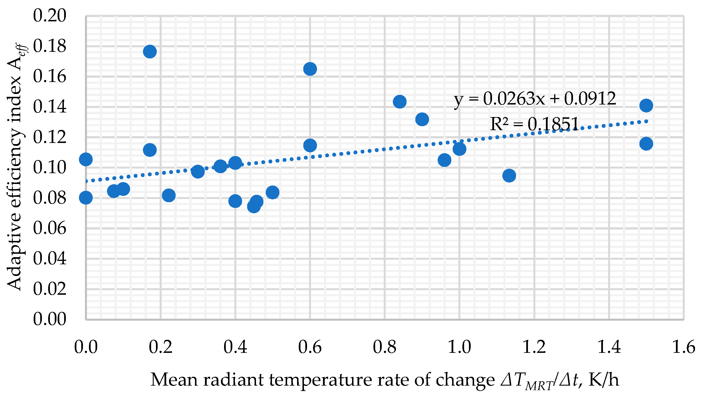 The proposed correction approach introduces an adaptive efficiency index Aeff derived from measured transient descriptors. The regression form and especially the non-zero baseline offset imply that the correction may compensate a persistent difference in the tested dataset. Interpreting the coefficients, the positive contribution of the air temperature rate of change indicates that faster warm-up of the air corresponds to a higher correction, i.e., occupants tend to feel warmer than steady-state PMV would predict during rapid increases in air temperature. In contrast, the negative contribution of the radiant temperature rate of change in the fitted expression indicates that, in this specific dataset, fast increases in mean radiant temperature reduce the required correction. The opposite signs indicate that, within this dataset, episodes with faster measured MRT increase tended to require a smaller additive correction to align PMV with TSV. The correction term captures transient mismatch between steady-state PMV and subjective sensation, so that the rapid convective warm-up produced a systematic bias in TSV relative to PMV, hence a larger positive correction, whereas periods with rising measured MRT were frequently accompanied by smaller TSV-PMV residuals, so the regression assigned a compensating negative weight. This behaviour is also consistent with the empirical finding that the ΔTMRT/Δt relationship is scattered, indicating that radiant dynamics were a secondary driver under the present measurement layout, and that the fitted coefficient should be interpreted as dataset-specific.