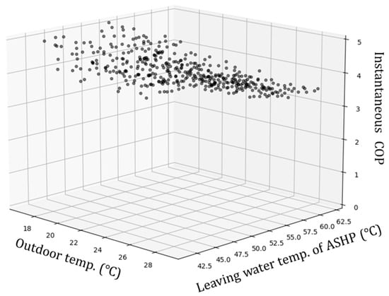 To assess the gap between rated and in situ performance, a predictive COP model was developed using manufacturer-provided catalog data. These data specify COP values under varying combinations of outdoor air temperature () and leaving water temperature (), ranging from −15 °C to 35 °C and 30 °C to 45 °C, respectively. A bi-quadratic regression analysis was performed using these two variables as independent predictors, resulting in the following model: