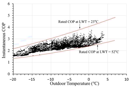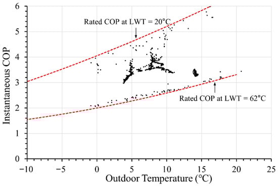 For DHW operation in summer, the average outdoor temperature was approximately 27.4 °C (range: 13.7–38.0 °C), with average LWT and return temperatures of 47.0 °C and 40.8 °C, respectively. The average COP reached 4.01, representing a 2.5-fold improvement over the winter period. This enhancement is attributed to reduced compressor load and improved cycle efficiency due to elevated evaporation temperatures. Figure 6 illustrates the variation in instantaneous COP with respect to outdoor temperature and LWT.